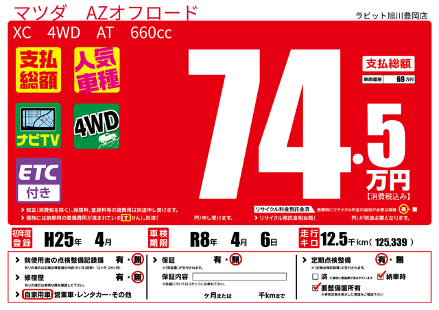 | 走行キロ | 0.6万km | 初年度登録 | H25年8月 |