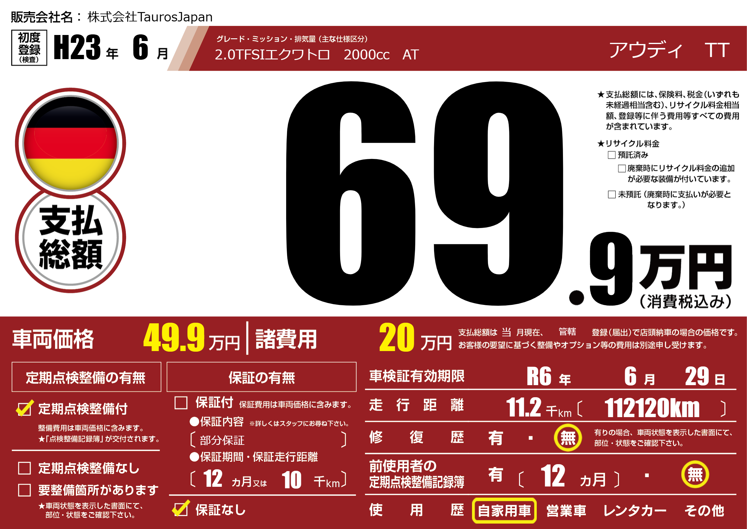 | 車名 | アウディ TT | グレード ミッション 排気量 |