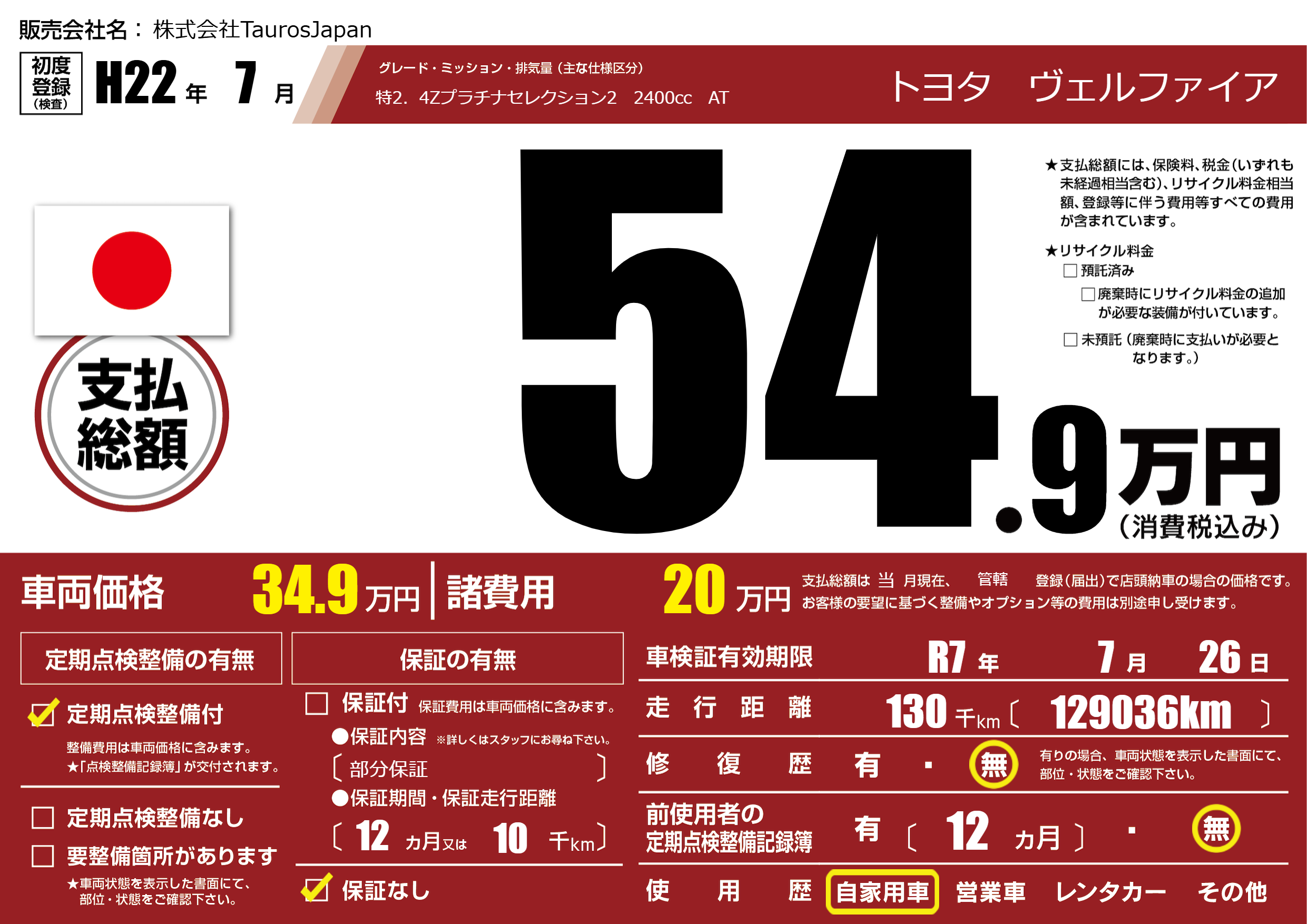 | 車名 | トヨタ ヴェルファイア | グレード ミッション 排気量 |