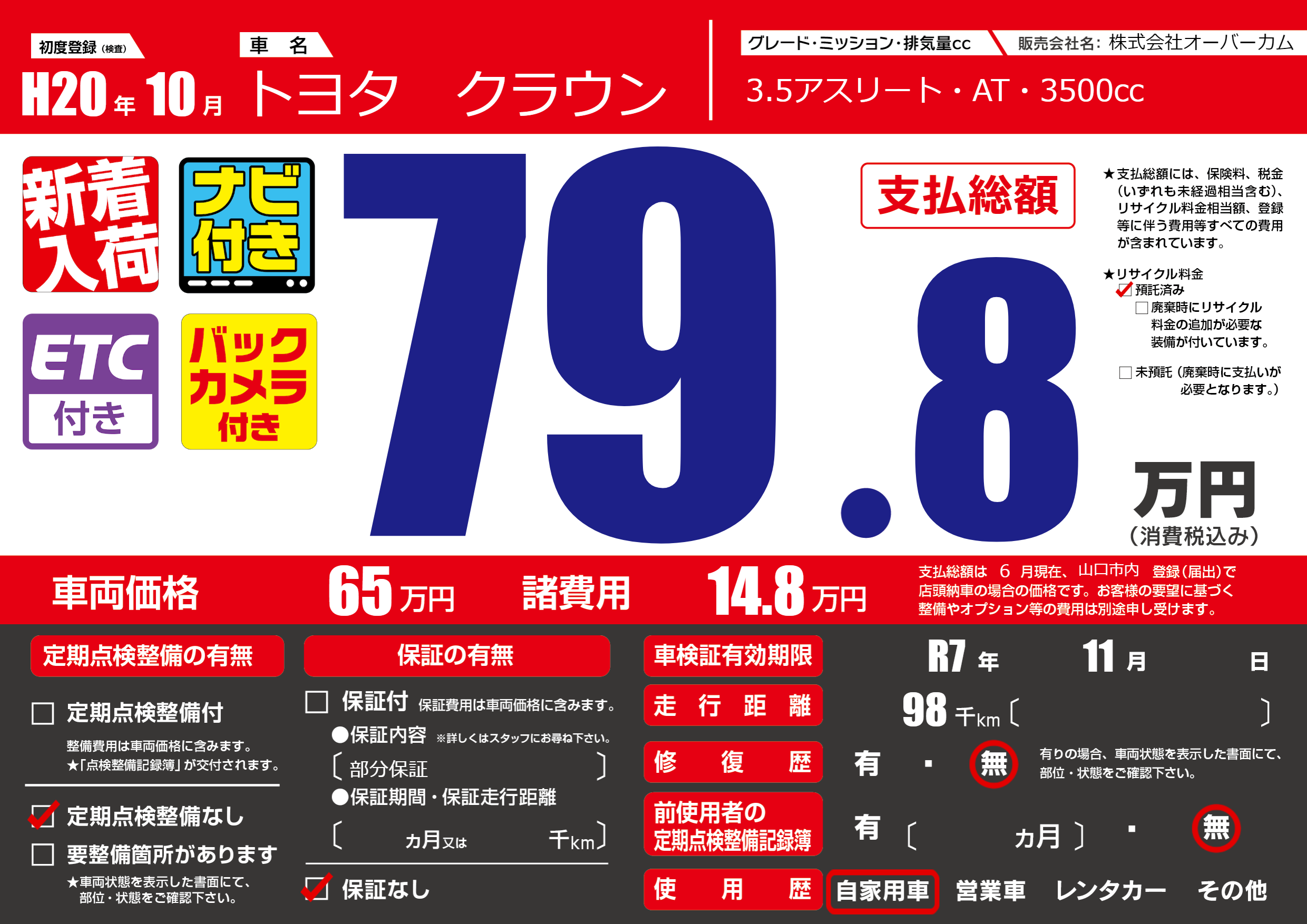 | 走行キロ | 9.8万km | 初年度登録 | H20年10月 |
