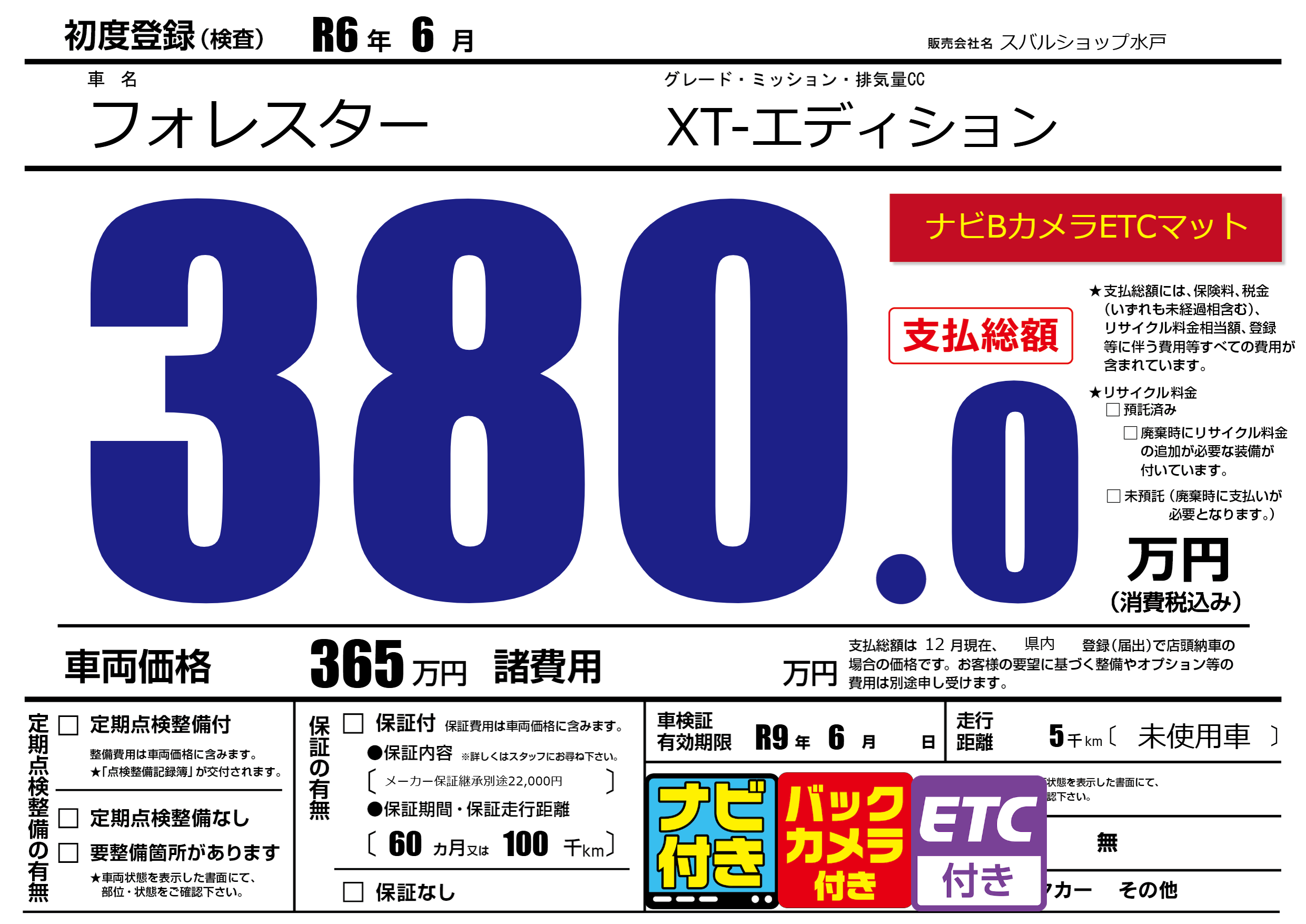 | 車名 | フォレスター | グレード ミッション 排気量 |
