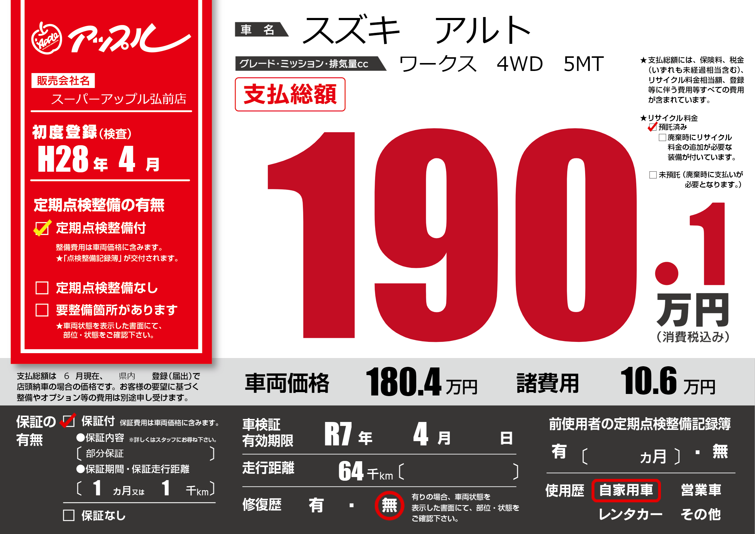 | 車検制限 | R7年 4月 - 日 | ||