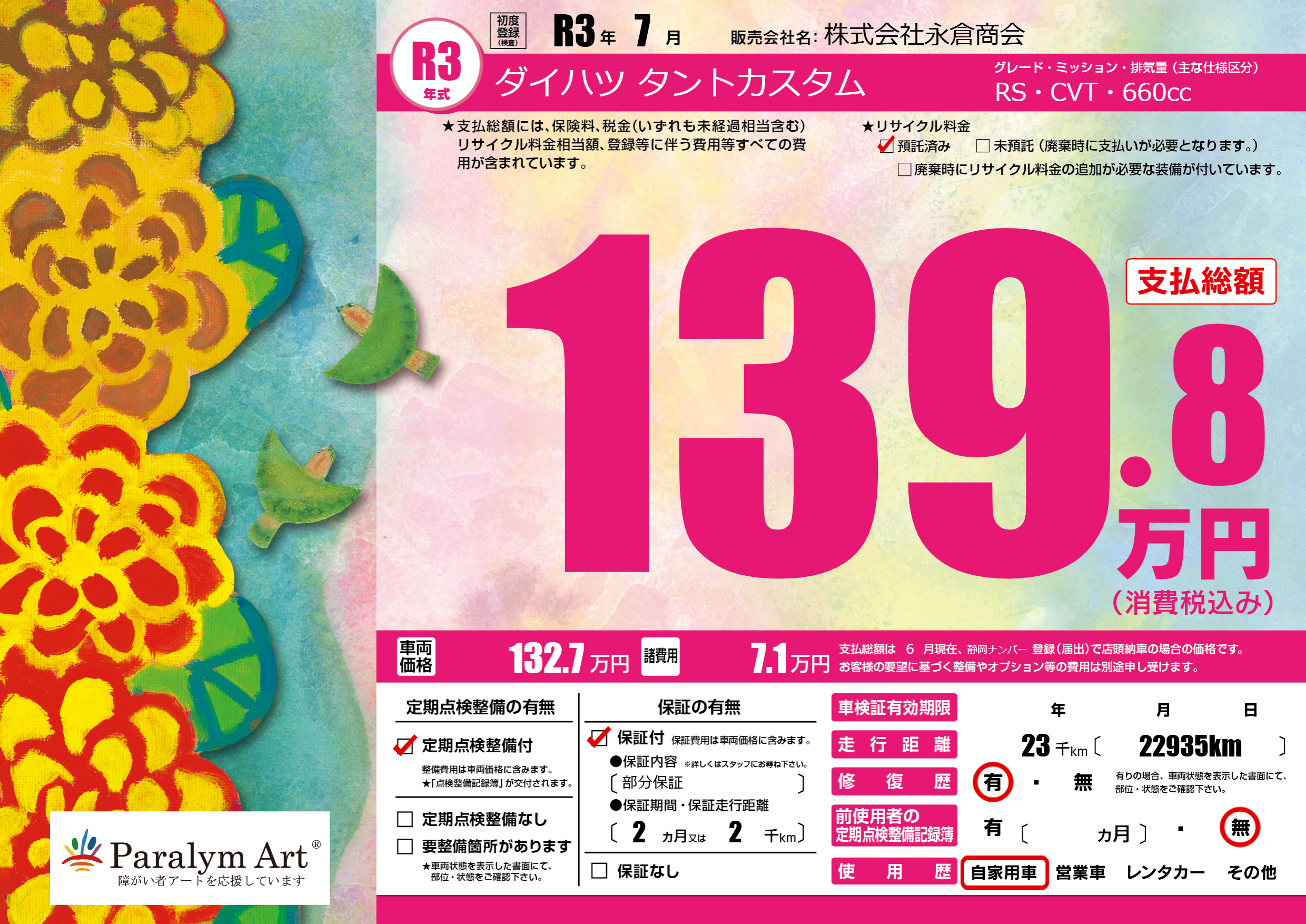 | 走行キロ | 2.3万km | 初年度登録 | R3年7月 |