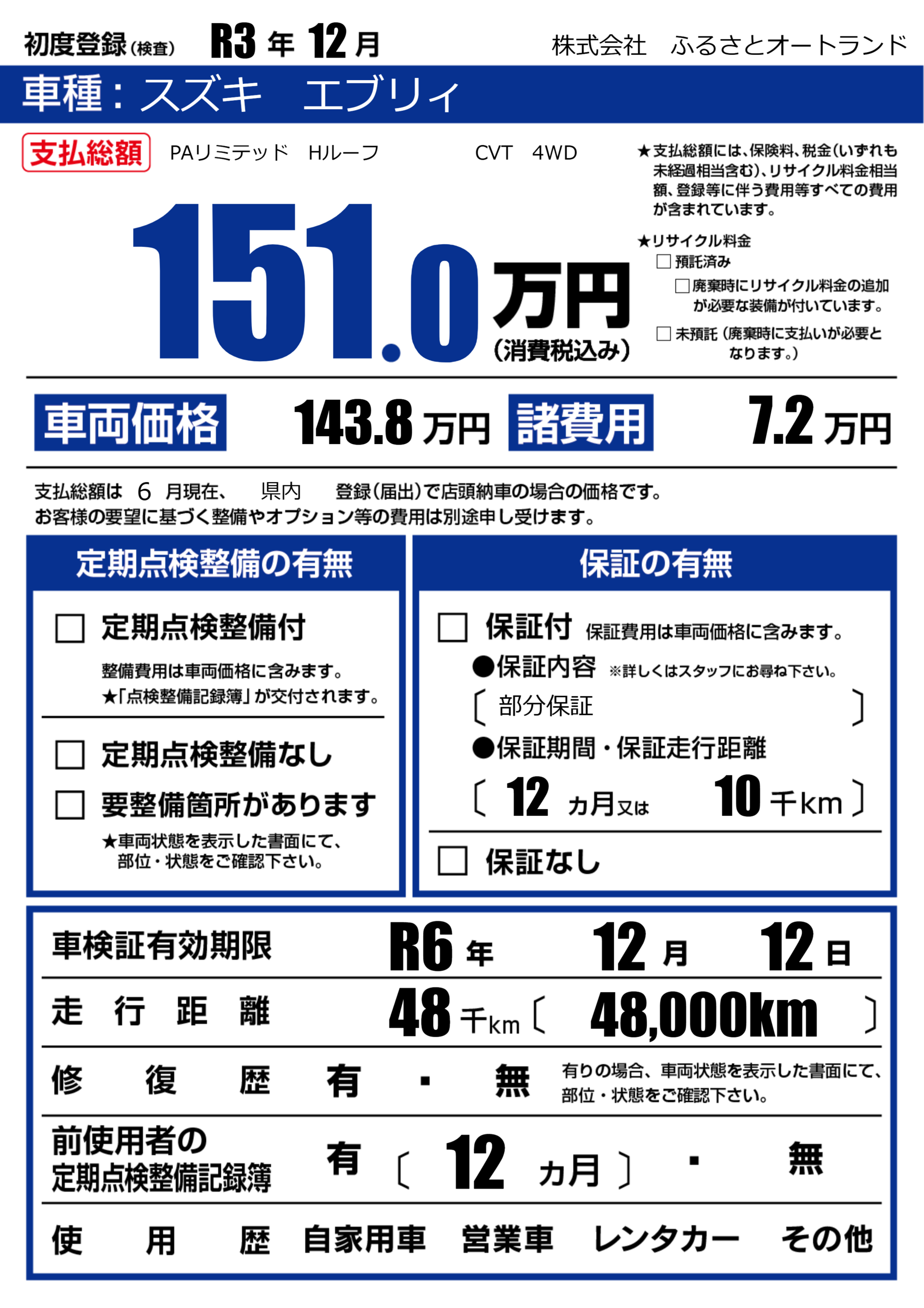 なし | 車検制限 | R6年12月12月 |