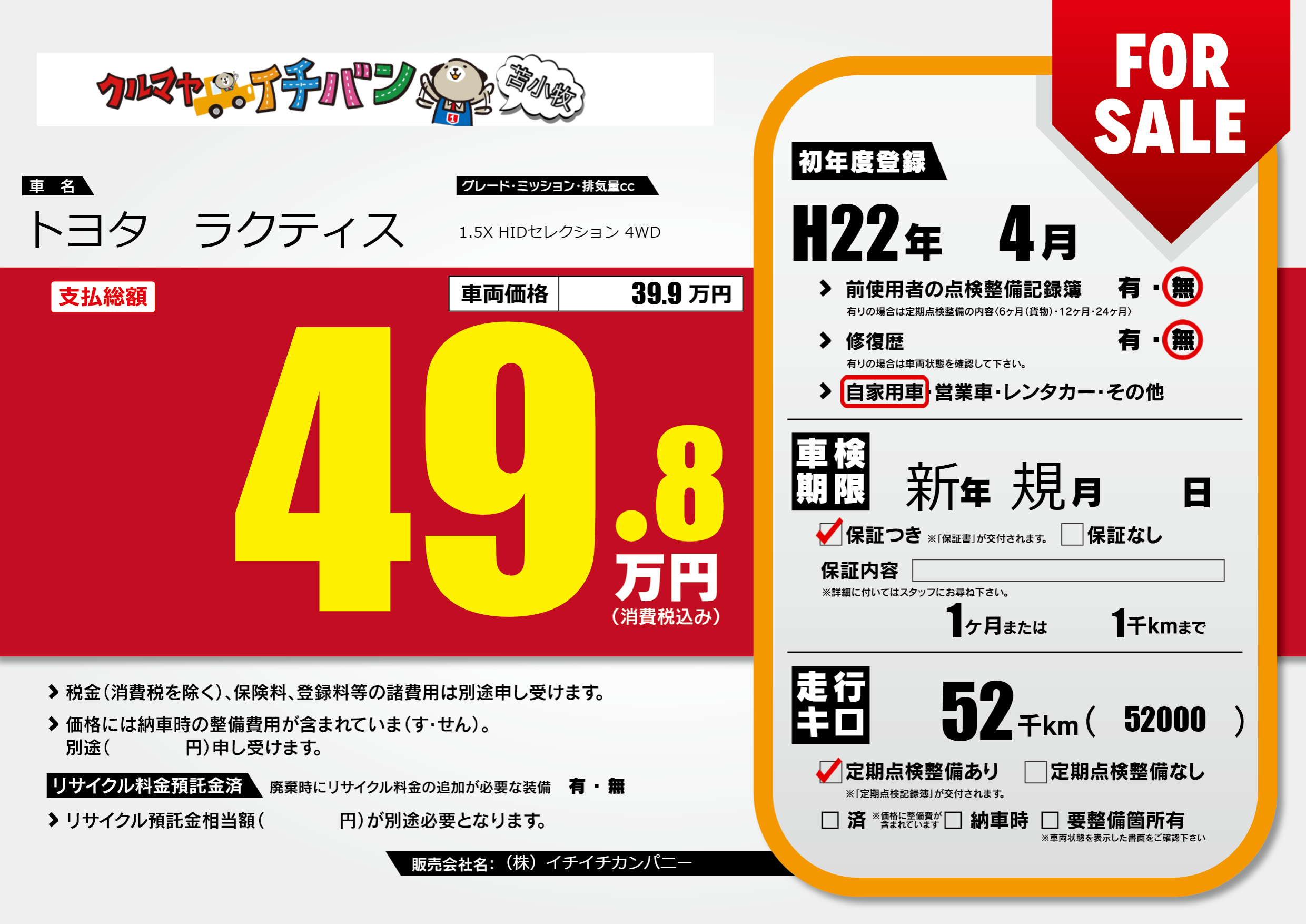 | 車名 | トヨタ ラクティス | グレード ミッション 排気量 |
