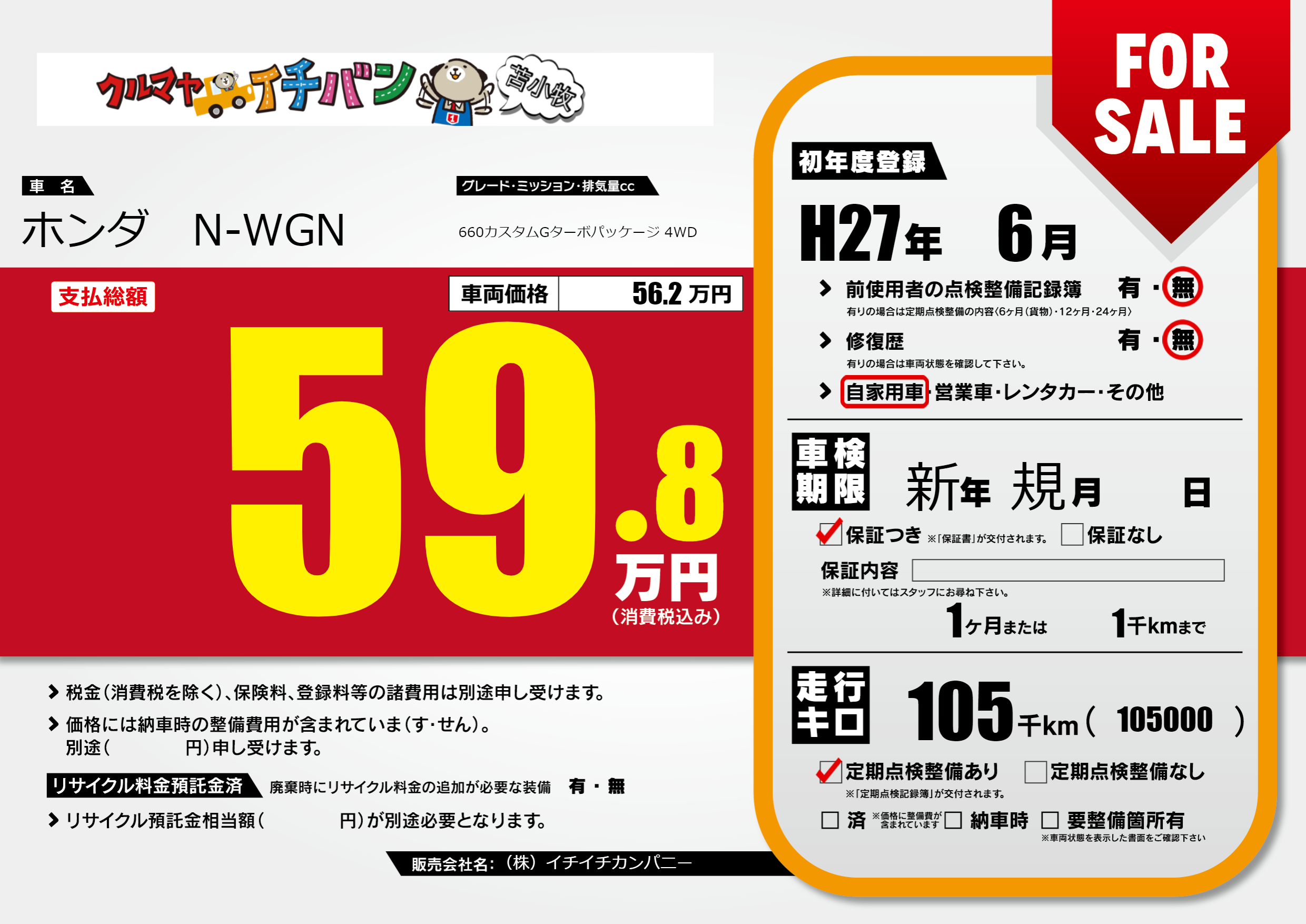 | 車名 | ホンダ N-WGN | グレード ミッション 排気量 |