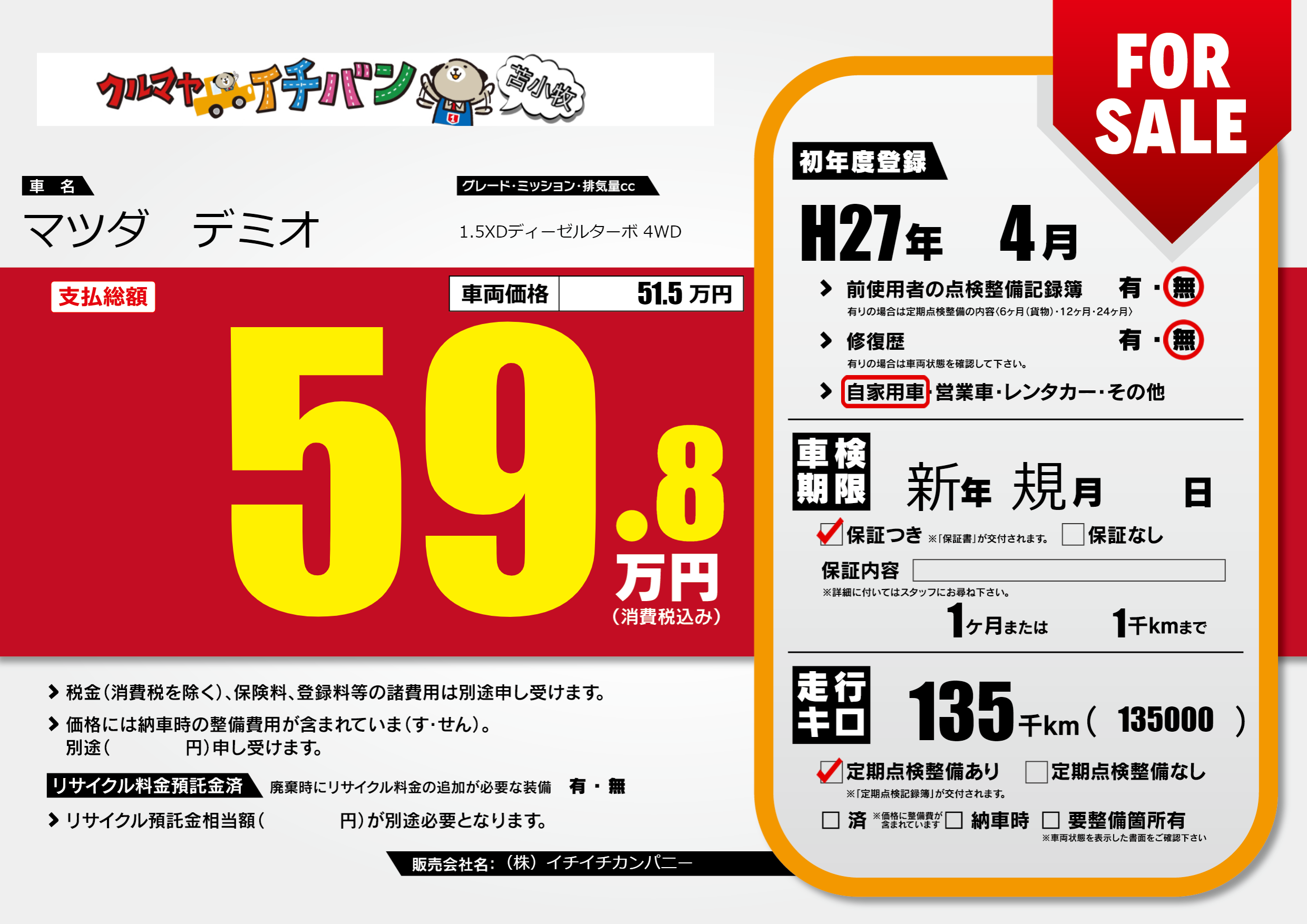 | 車名 | マツダ デミオ | グレード ミッション 排気量 |