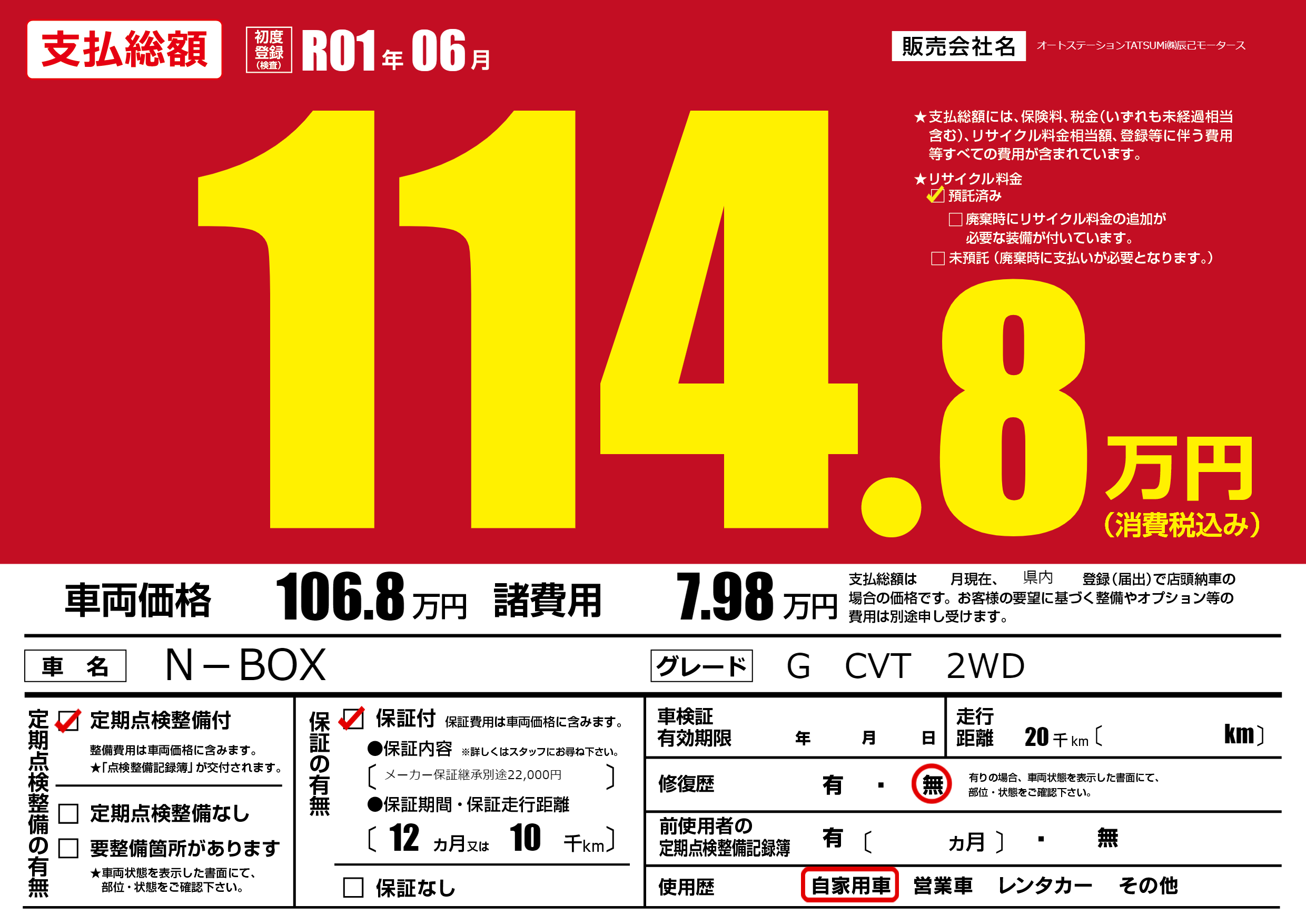 | 走行キロ | 2万km | 初年度登録 | R01年06月 |