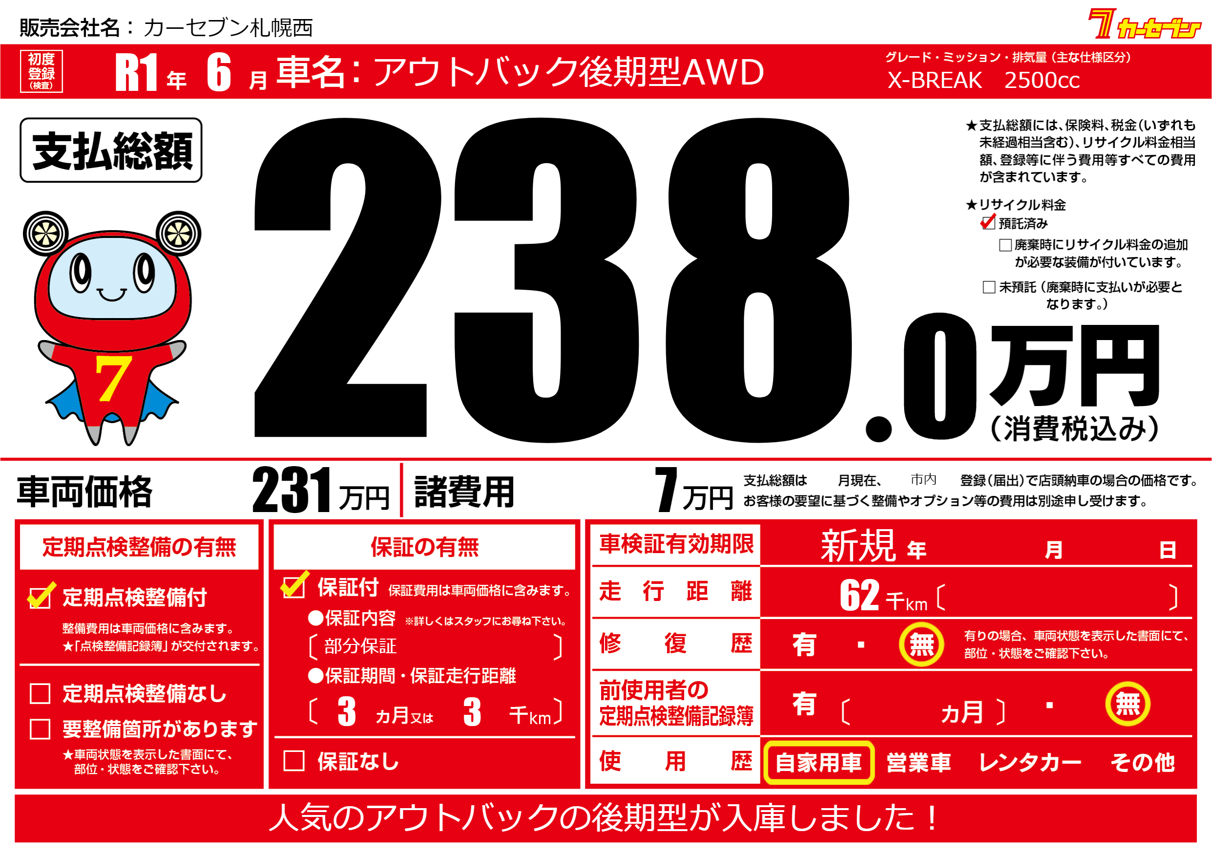 | 車名 | アウトバック後期型AWD | グレード ミッション 排気量 |