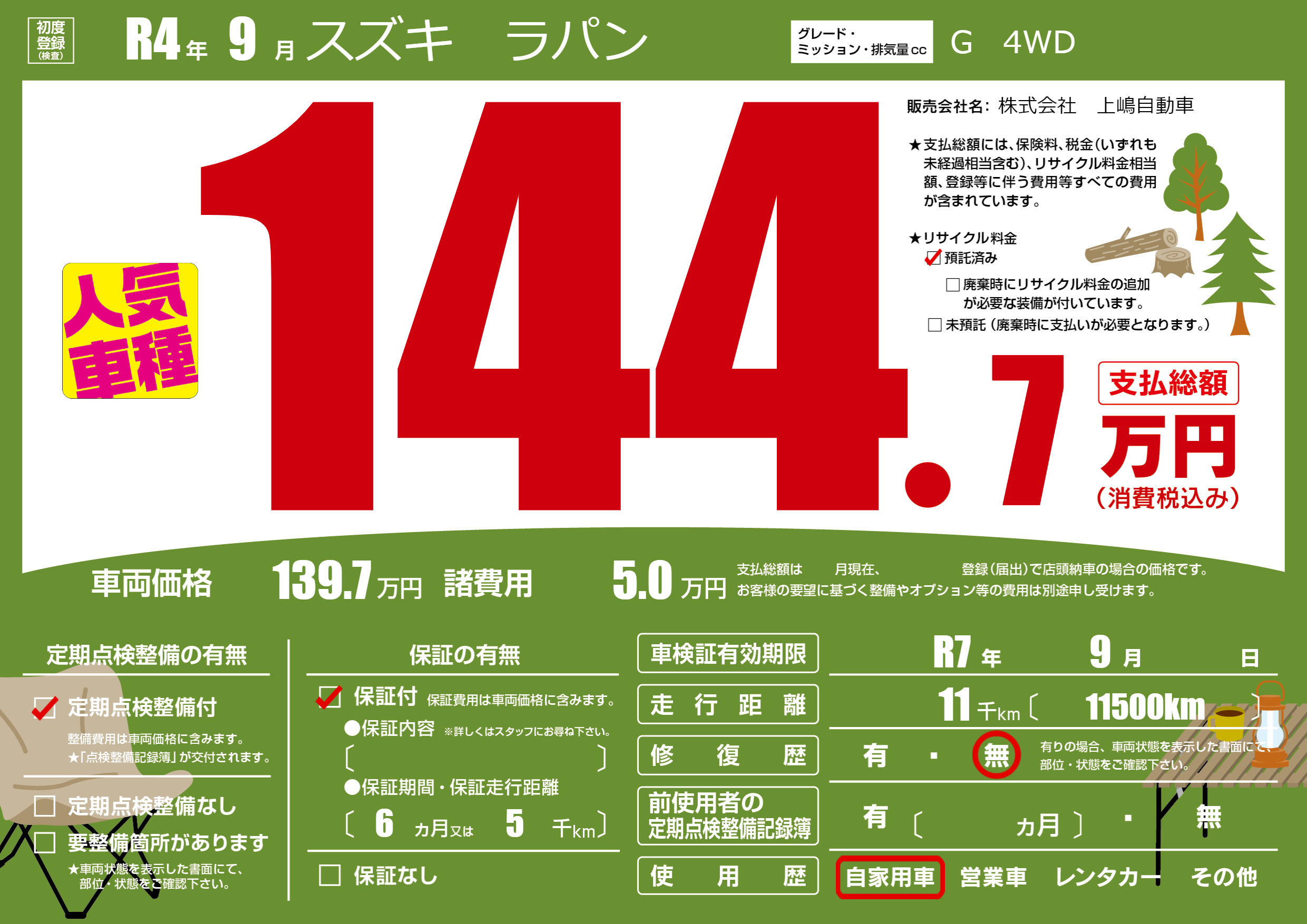 保証付き 保証内容(---) 6ヶ月または(5)千kmまで |