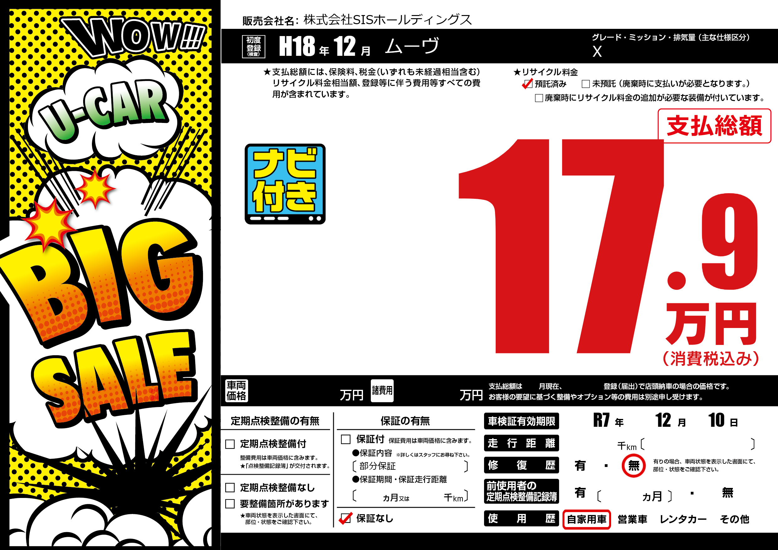 | 走行キロ | - | 初年度登録 | H18年12月 |