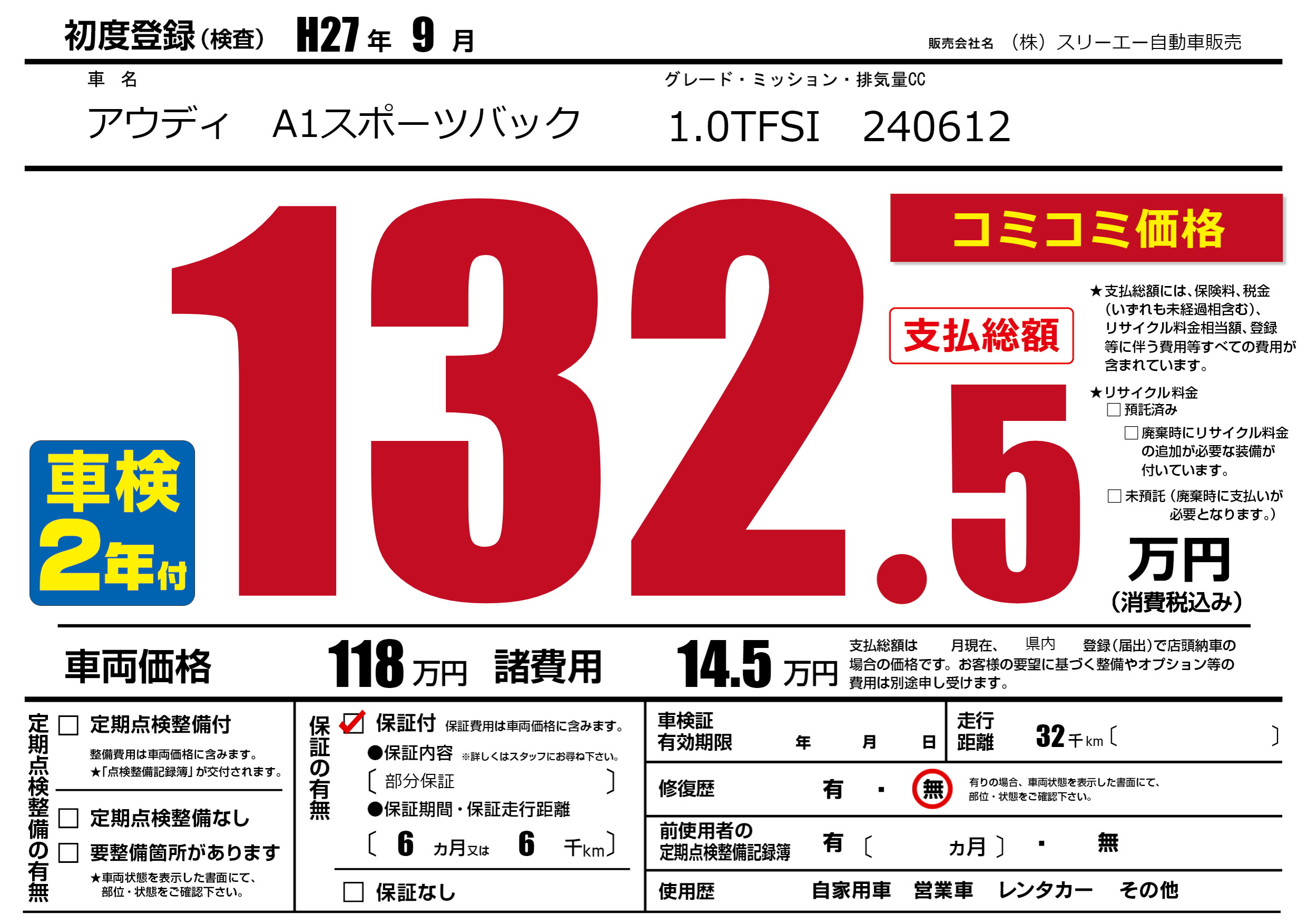 保証付き 保証内容(部分保証) 6ヶ月または(6)千kmまで |