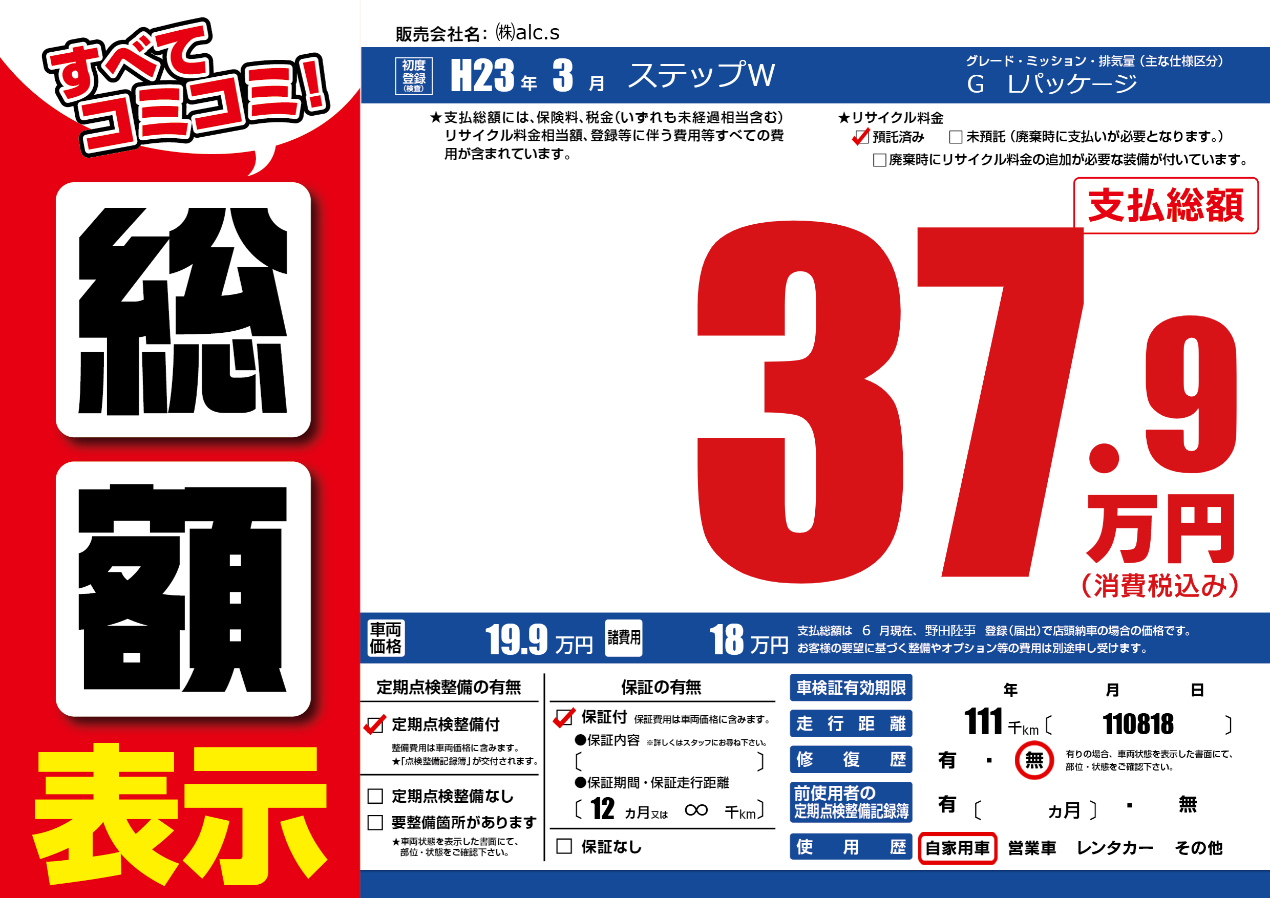 | 走行キロ | 11.1万km | 初年度登録 | H23年3月 |