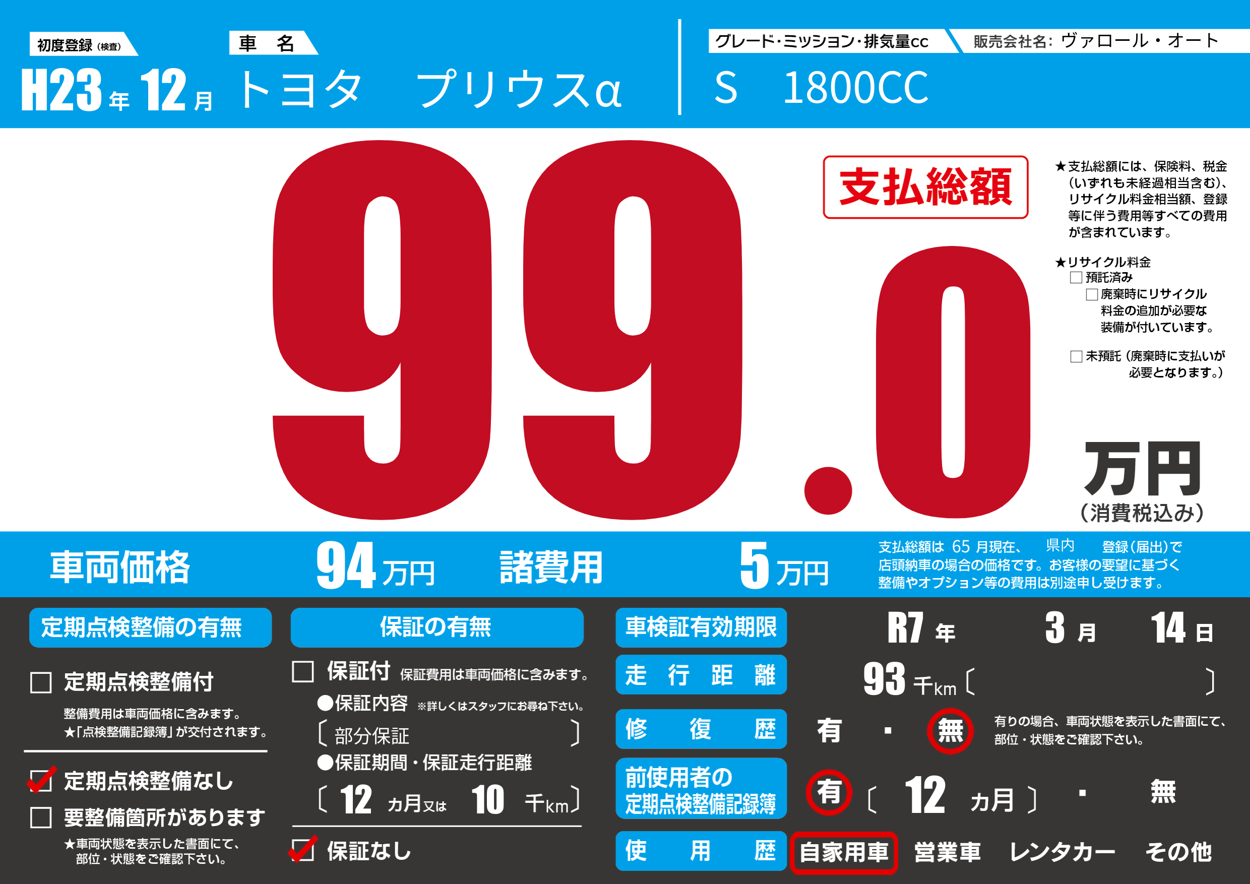 | 走行キロ | 9.3万km | 初年度登録 | H23年12月 |