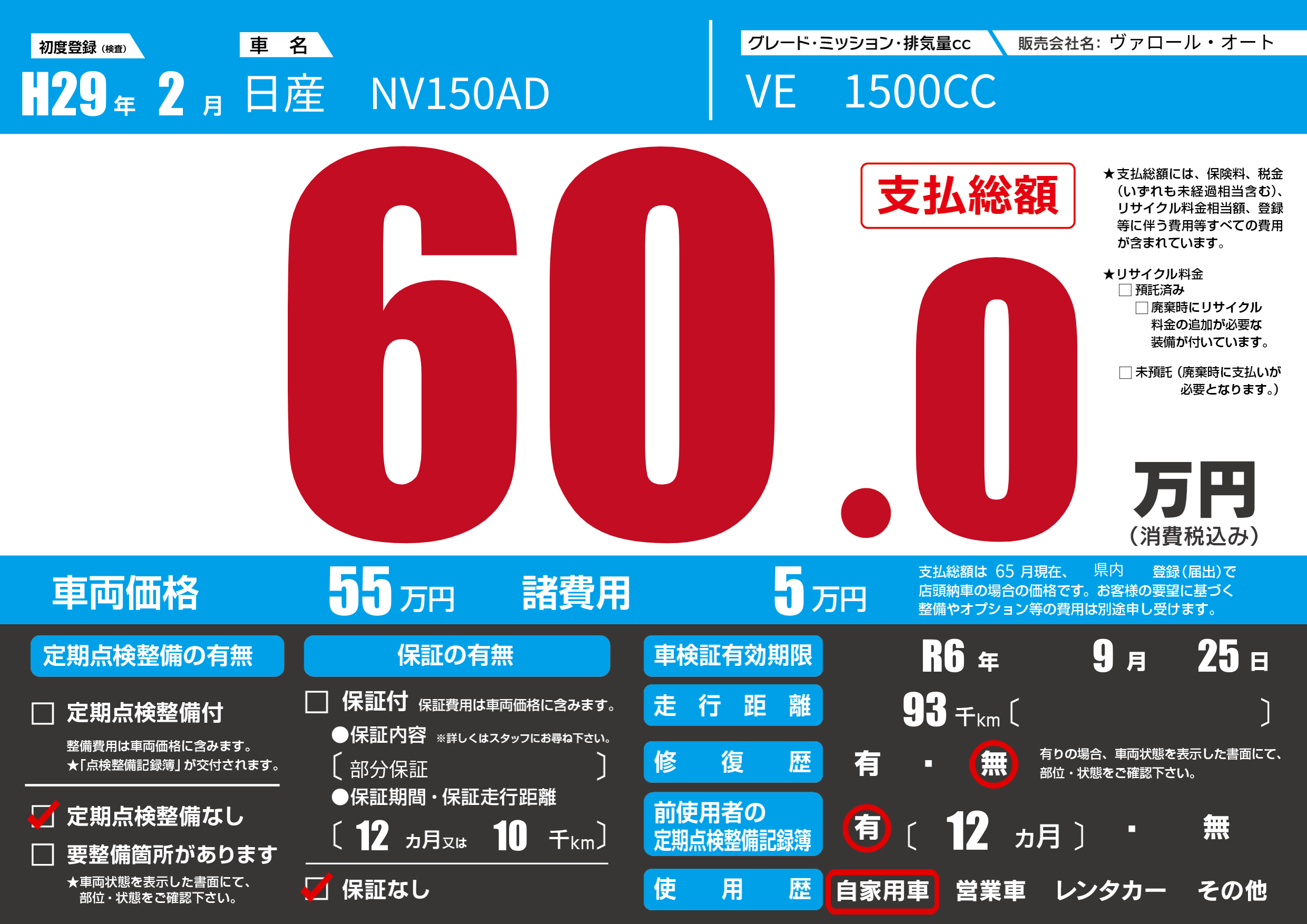 | 車名 | 日産 NV150AD | グレード ミッション 排気量 |