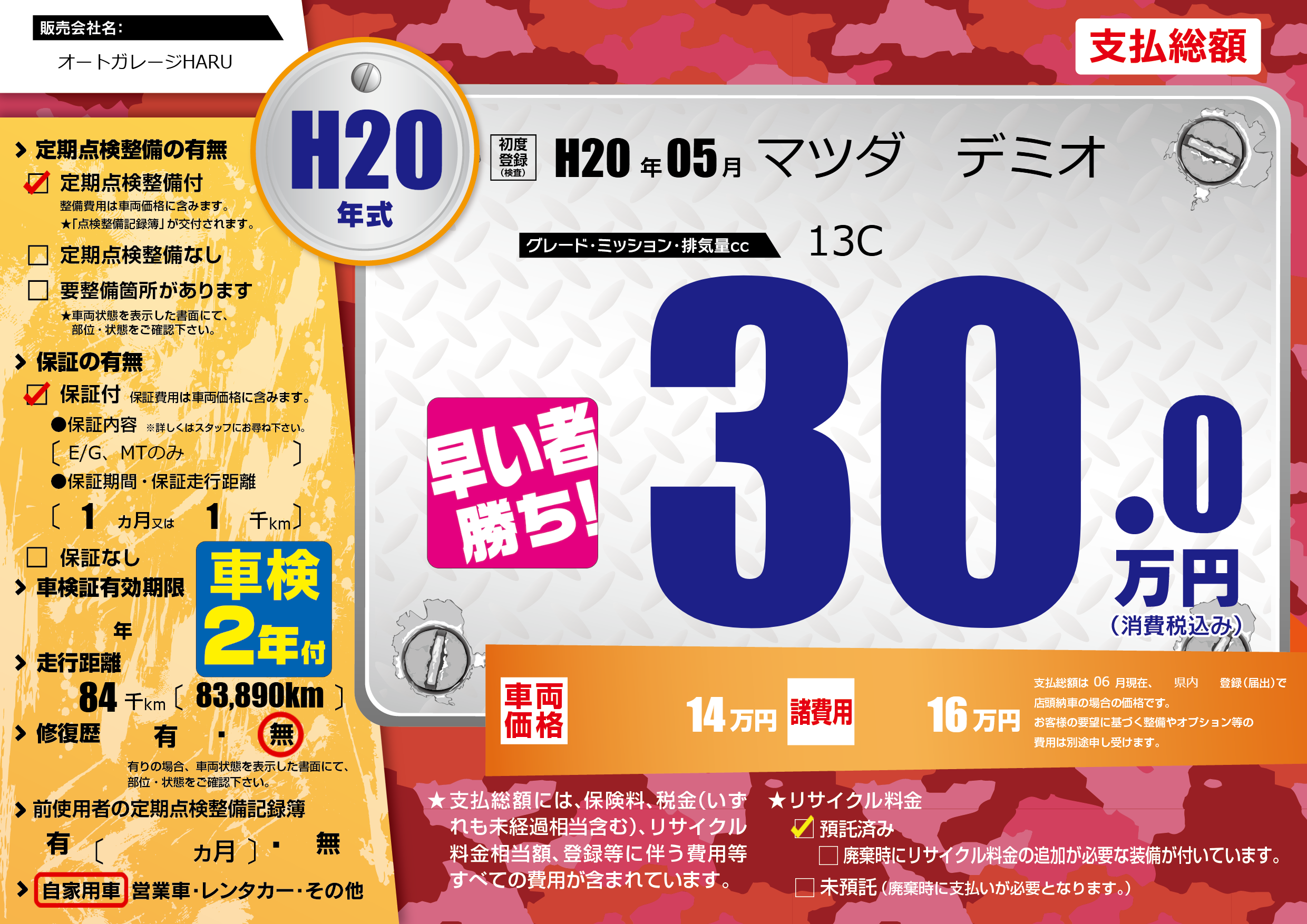 | 車名 | マツダ デミオ | グレード ミッション 排気量 |