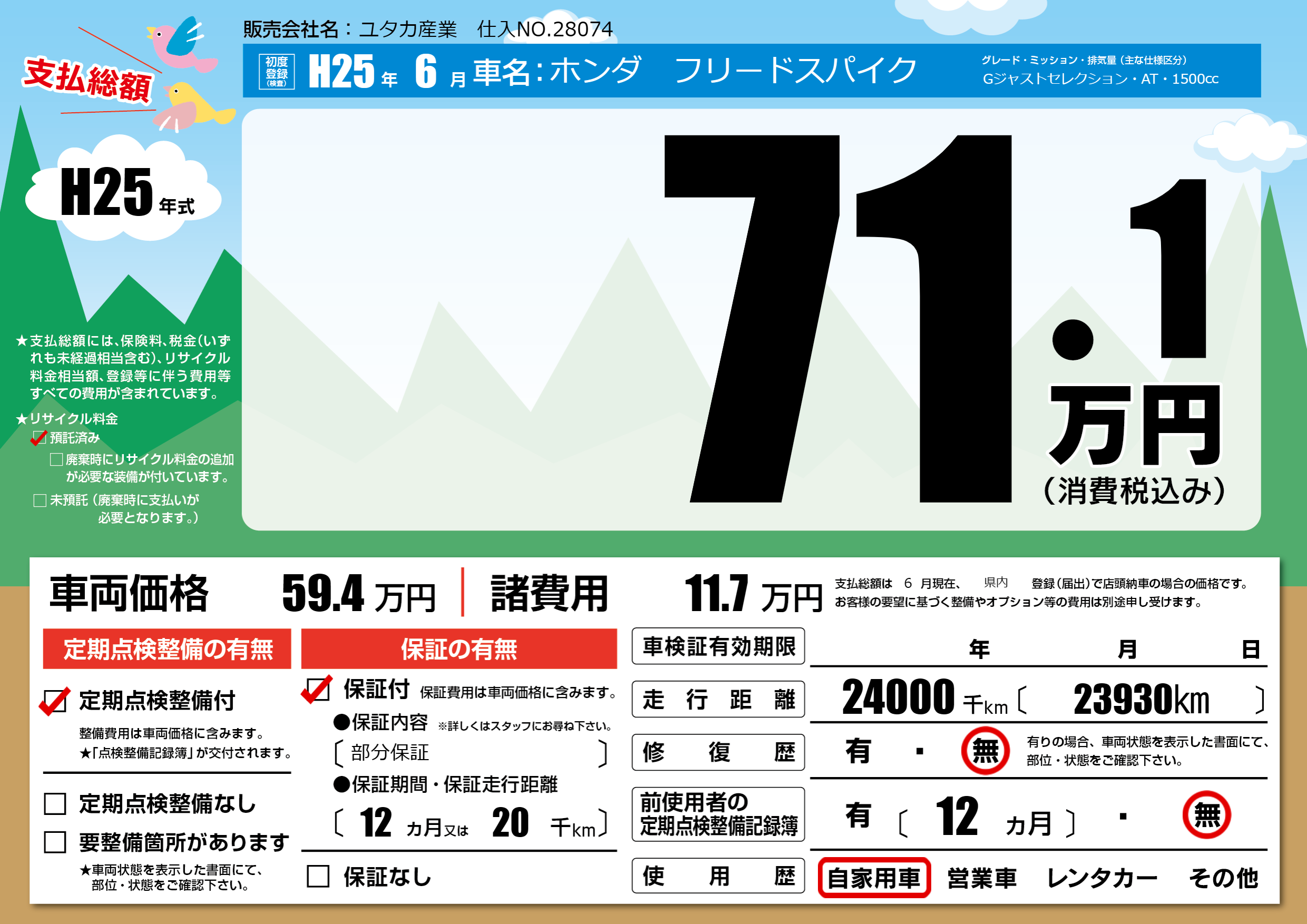 | 車名 | ホンダ フリードスパイク | グレード ミッション 排気量 |