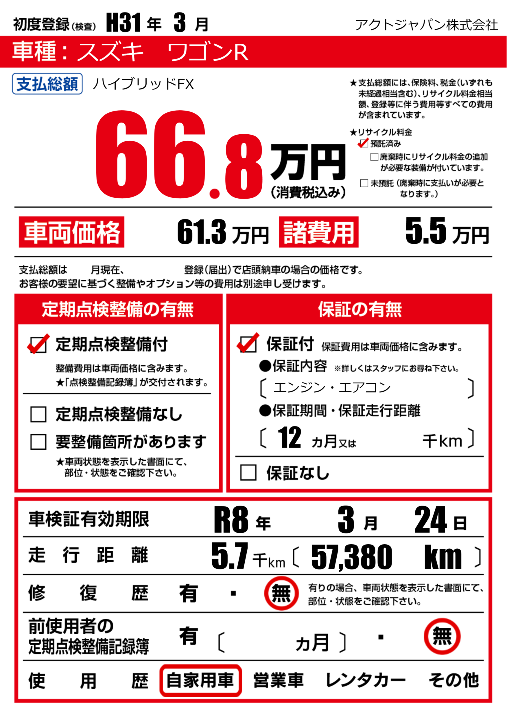 | 車名 | スズキ ワゴンR | グレード ミッション 排気量 |