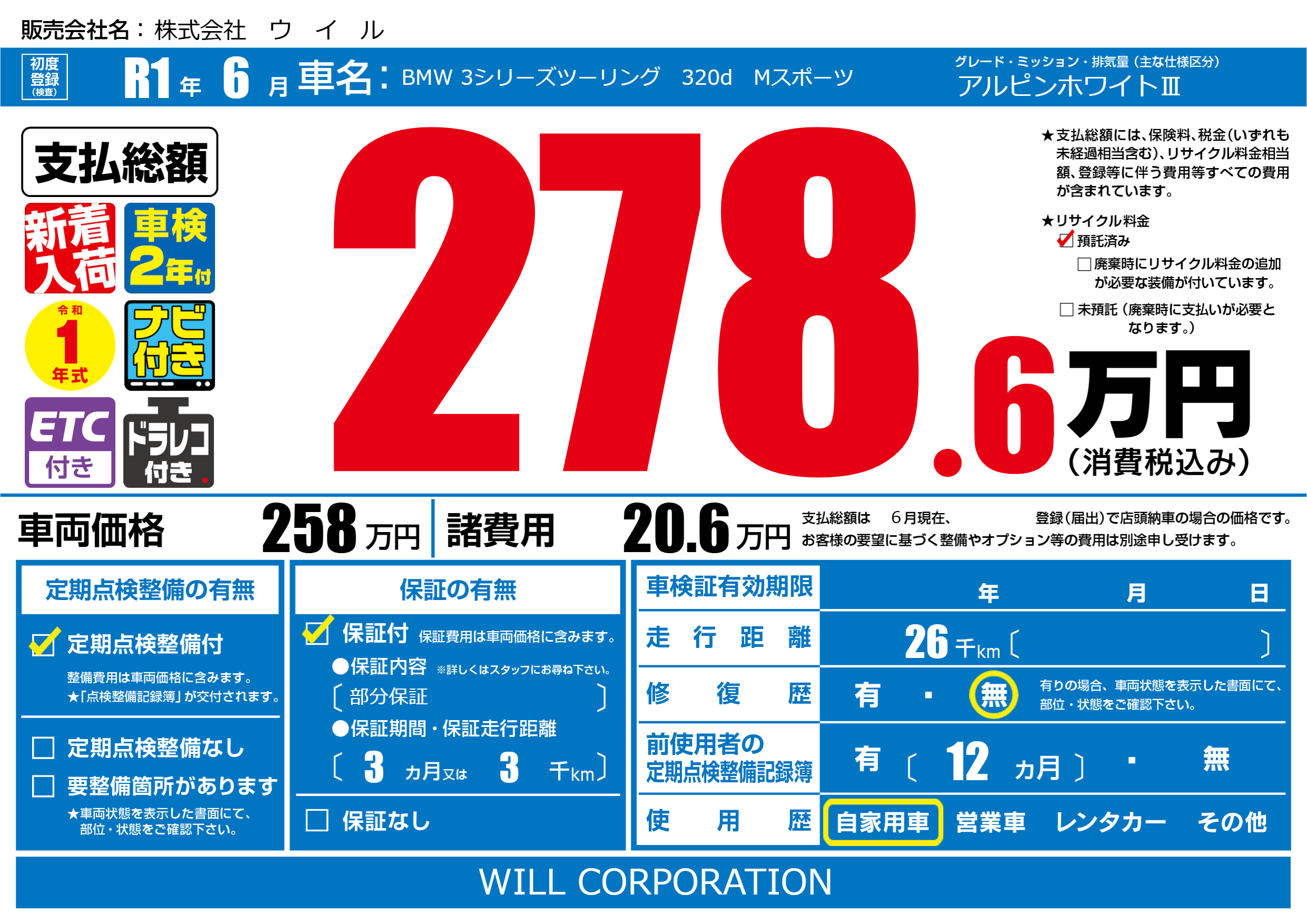 | 車名 | BMW 3シリーズツーリング 320d Mスポーツ | グレード ミッション 排気量 |