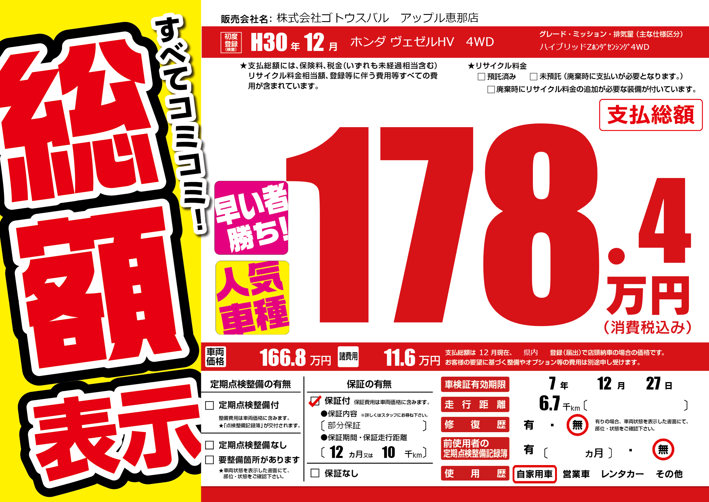 | 走行キロ | 0.6万km | 初年度登録 | H30年12月 |
