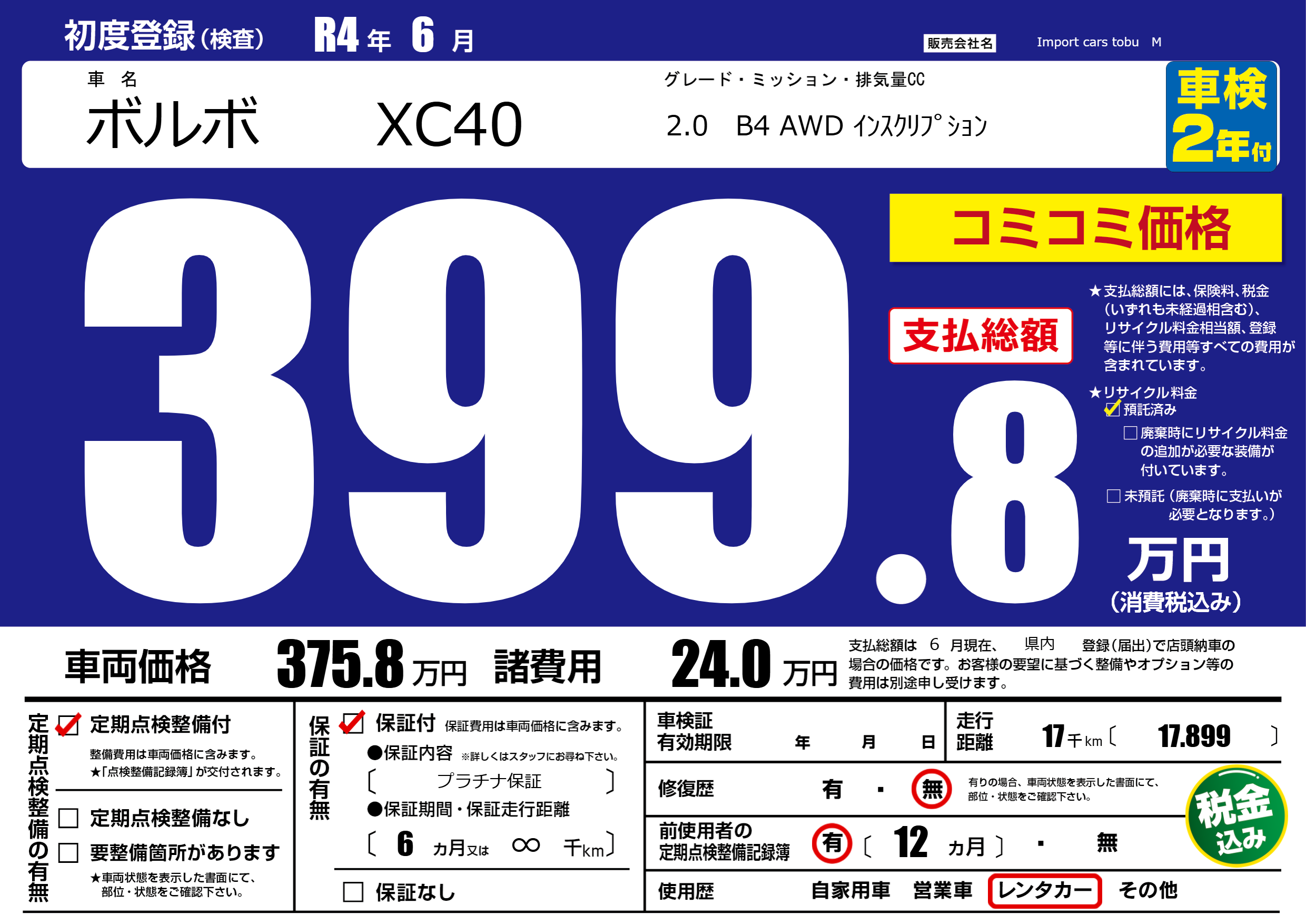 | 車名 | ボルボ XC40 | グレード ミッション 排気量 |