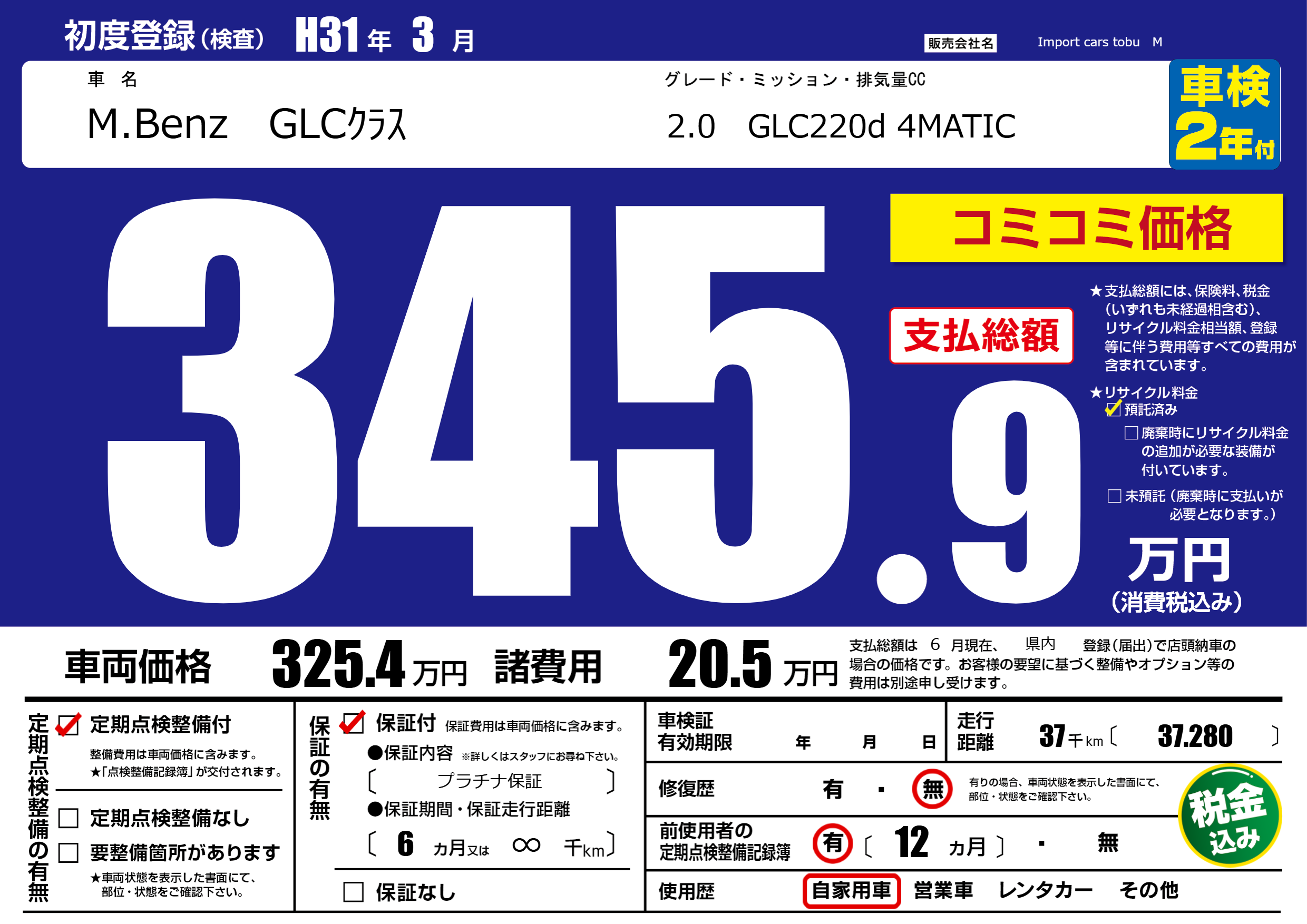 | 車名 | M.Benz GLCクラス | グレード ミッション 排気量 |