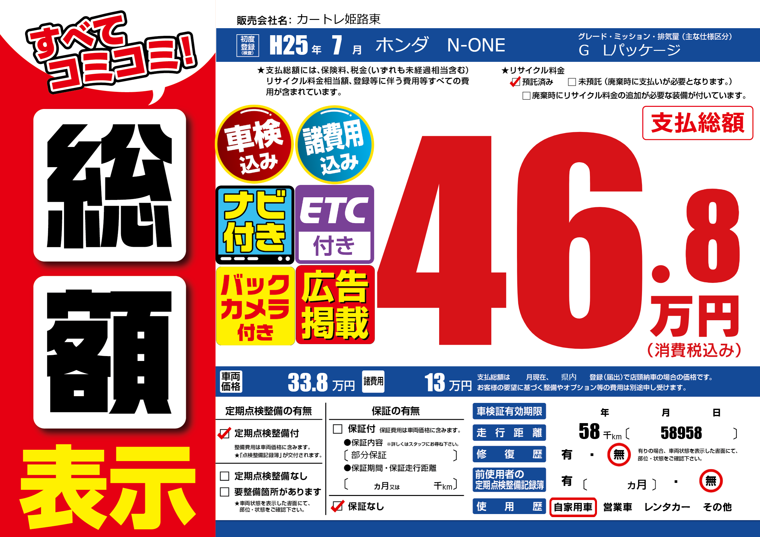 | 車名 | ホンダ N-ONE | グレード ミッション 排気量 |