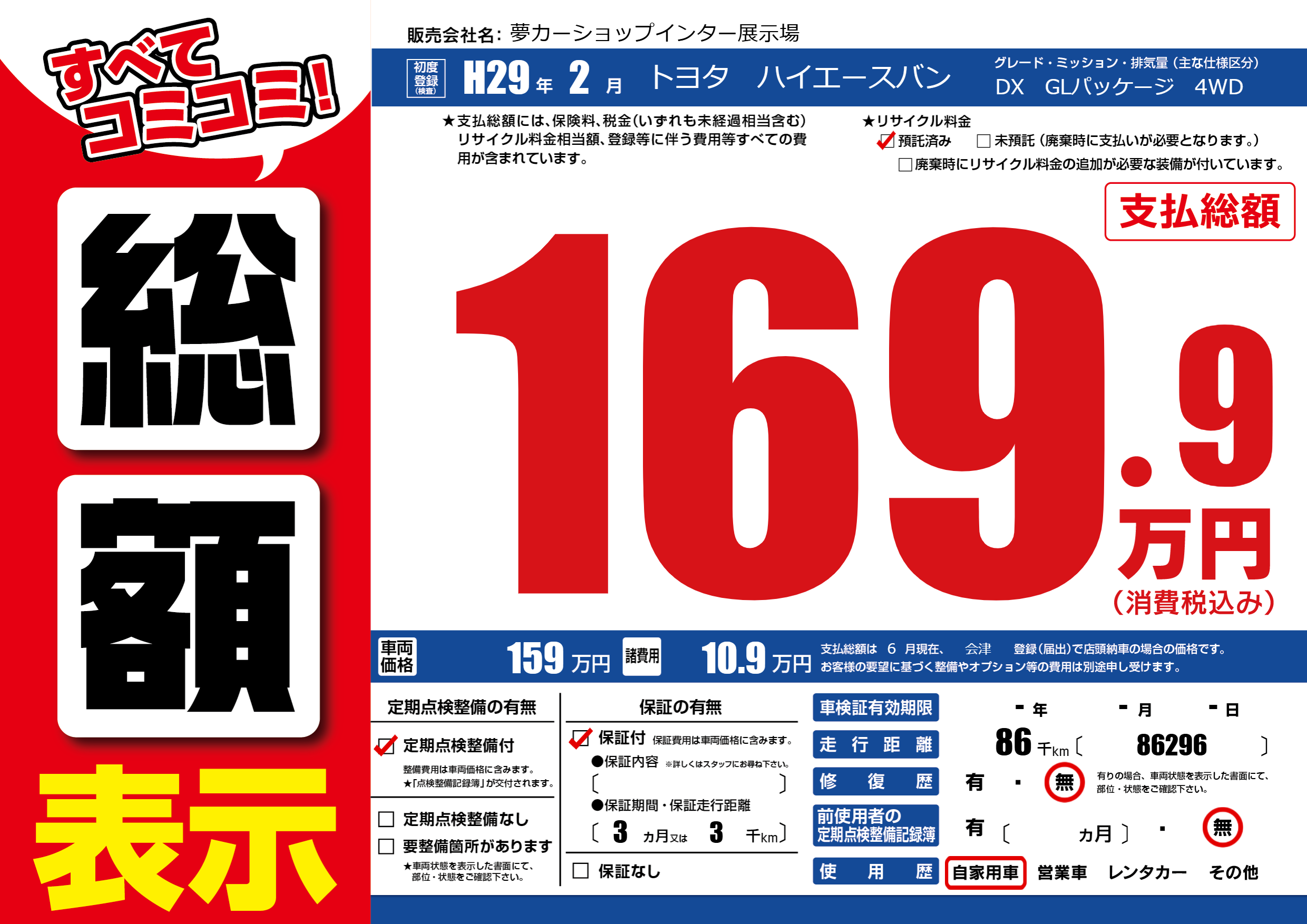 | 車名 | トヨタ ハイエースバン | グレード ミッション 排気量 |