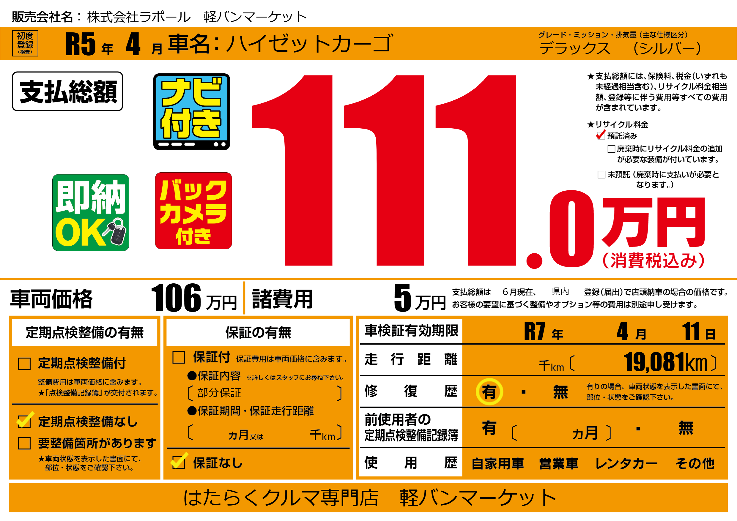 | 車検制限 | R7年 4月 11日 | ||