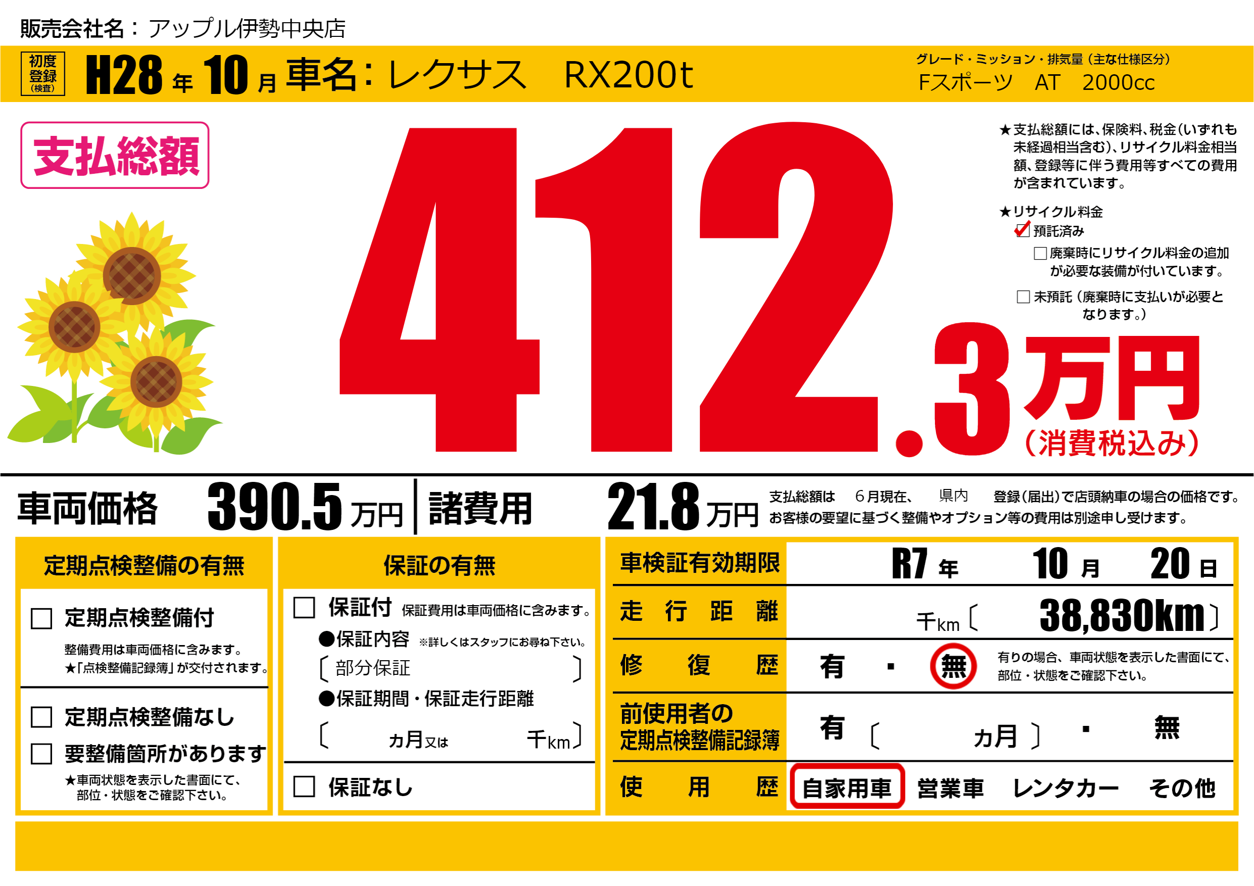 | 車名 | レクサス RX200t | グレード ミッション 排気量 |