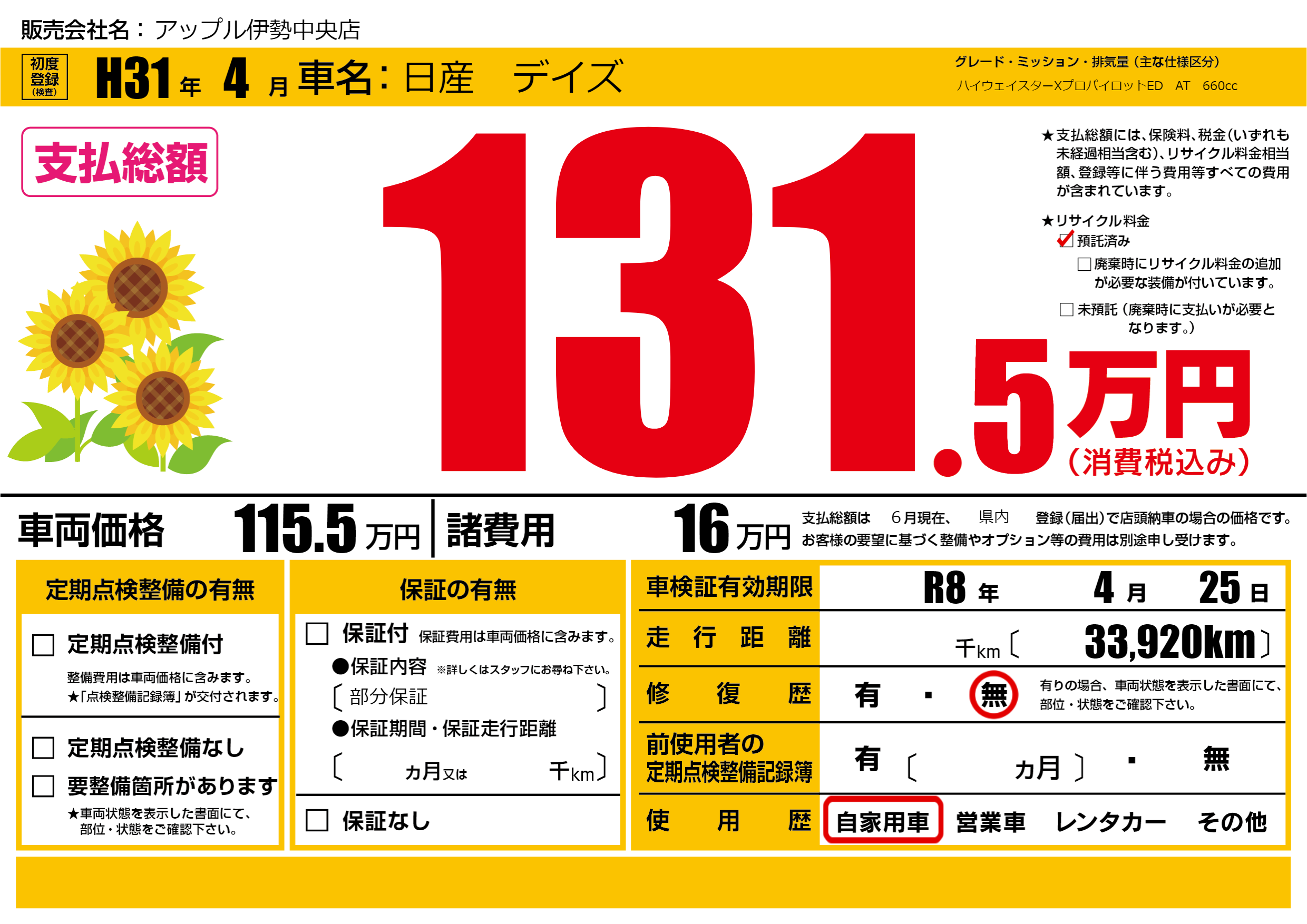 | 車名 | 日産 デイズ | グレード ミッション 排気量 |
