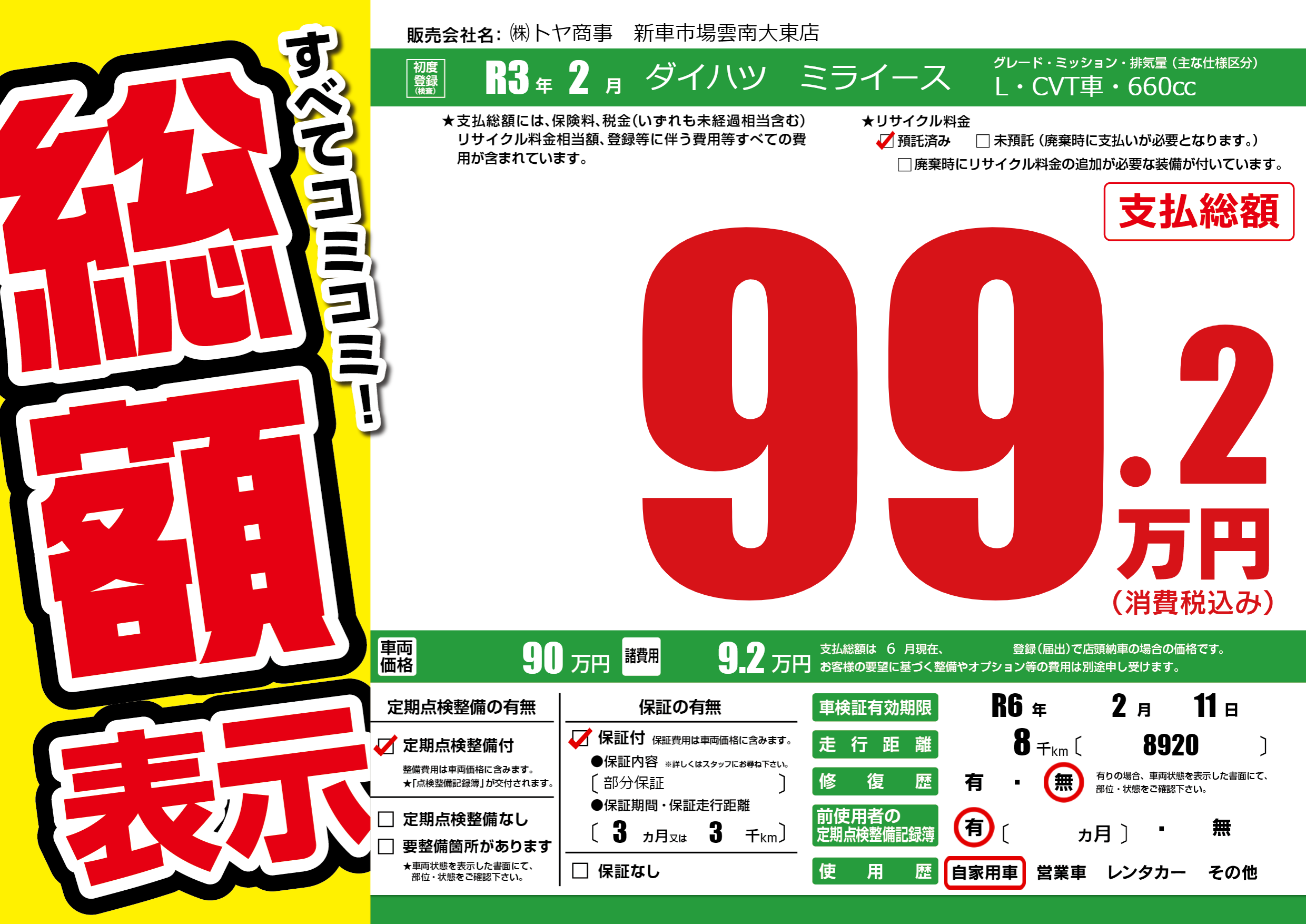 保証付き 保証内容(部分保証) 3ヶ月または(3)千kmまで |