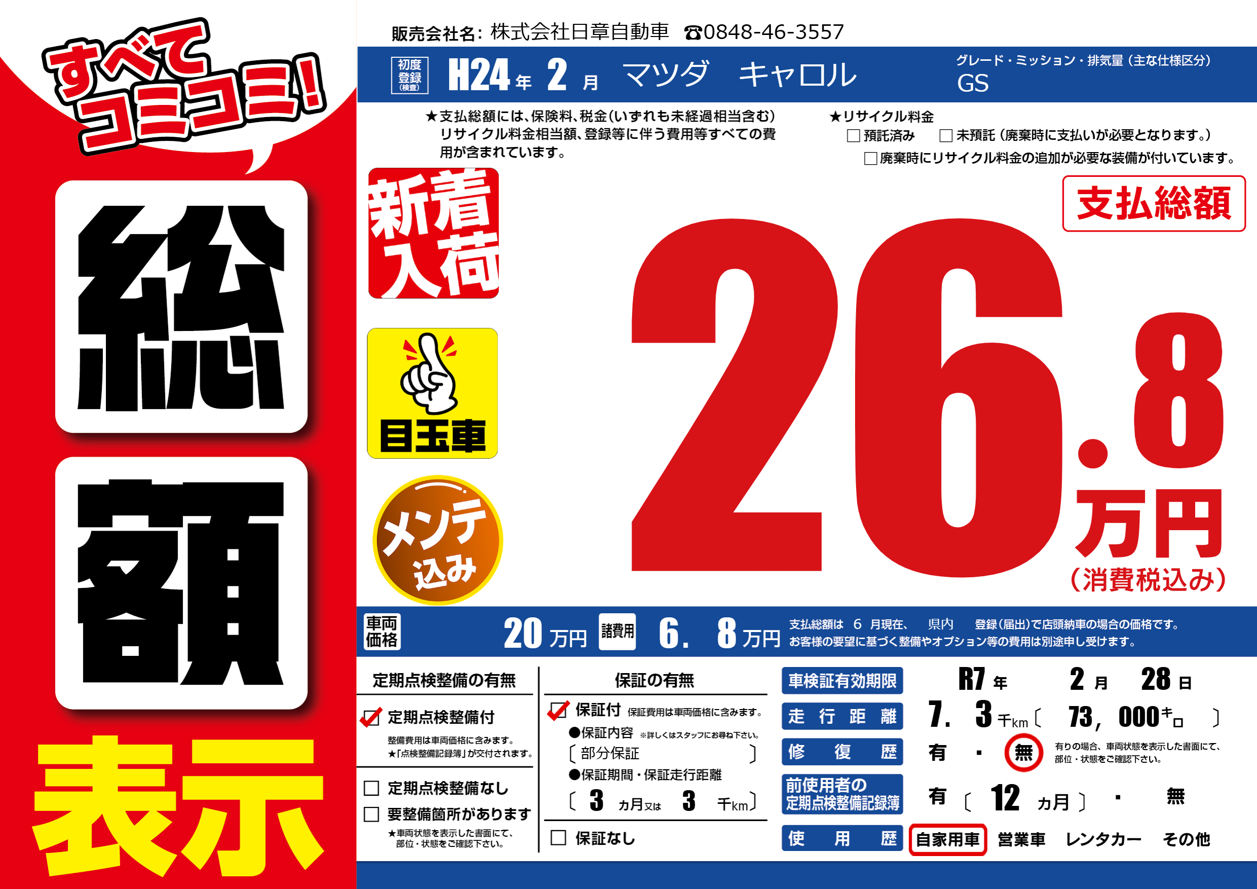 | 車名 | マツダ キャロル | グレード ミッション 排気量 |