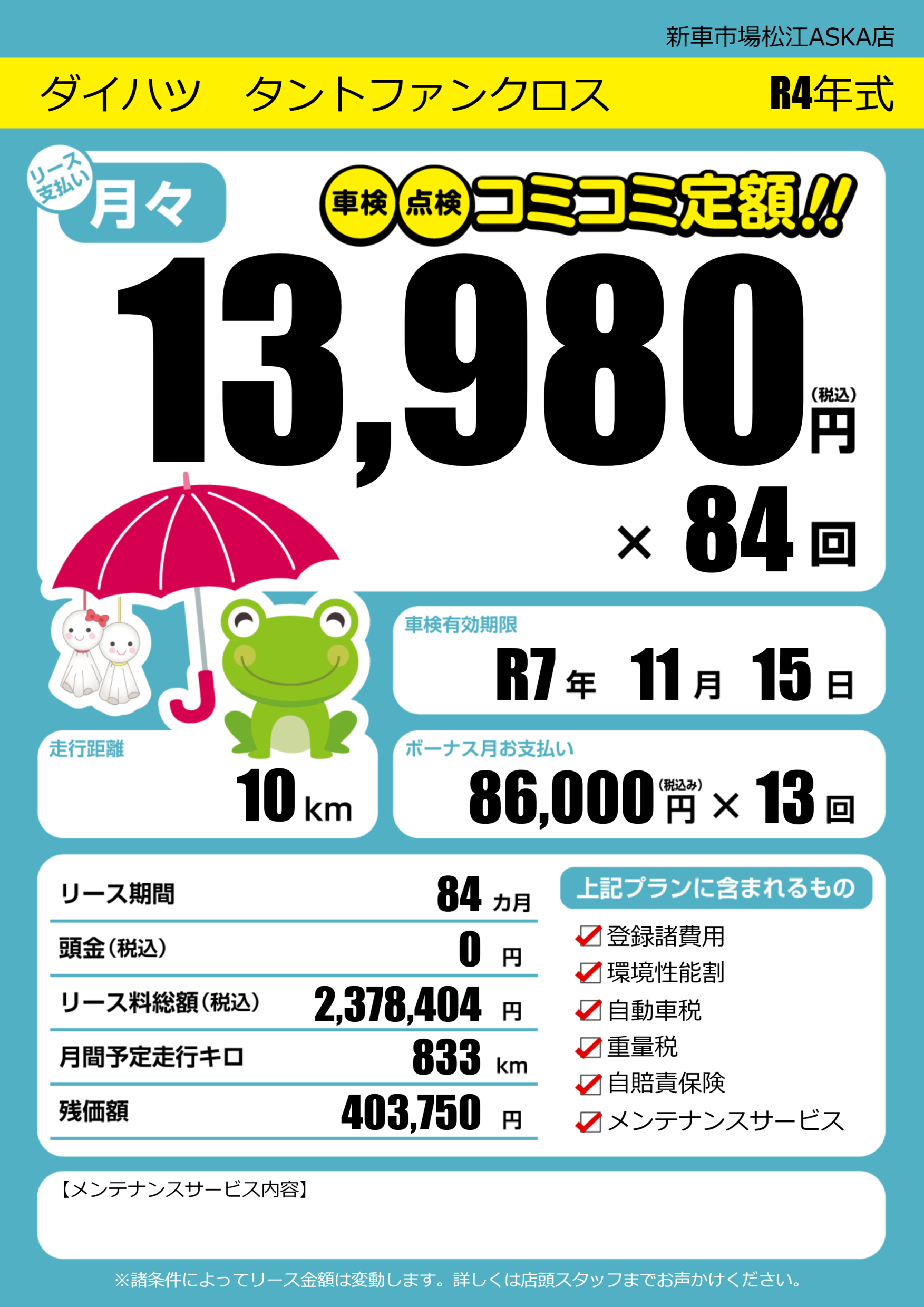 | 車名 | ダイハツ タントファンクロス | グレード ミッション 排気量 |