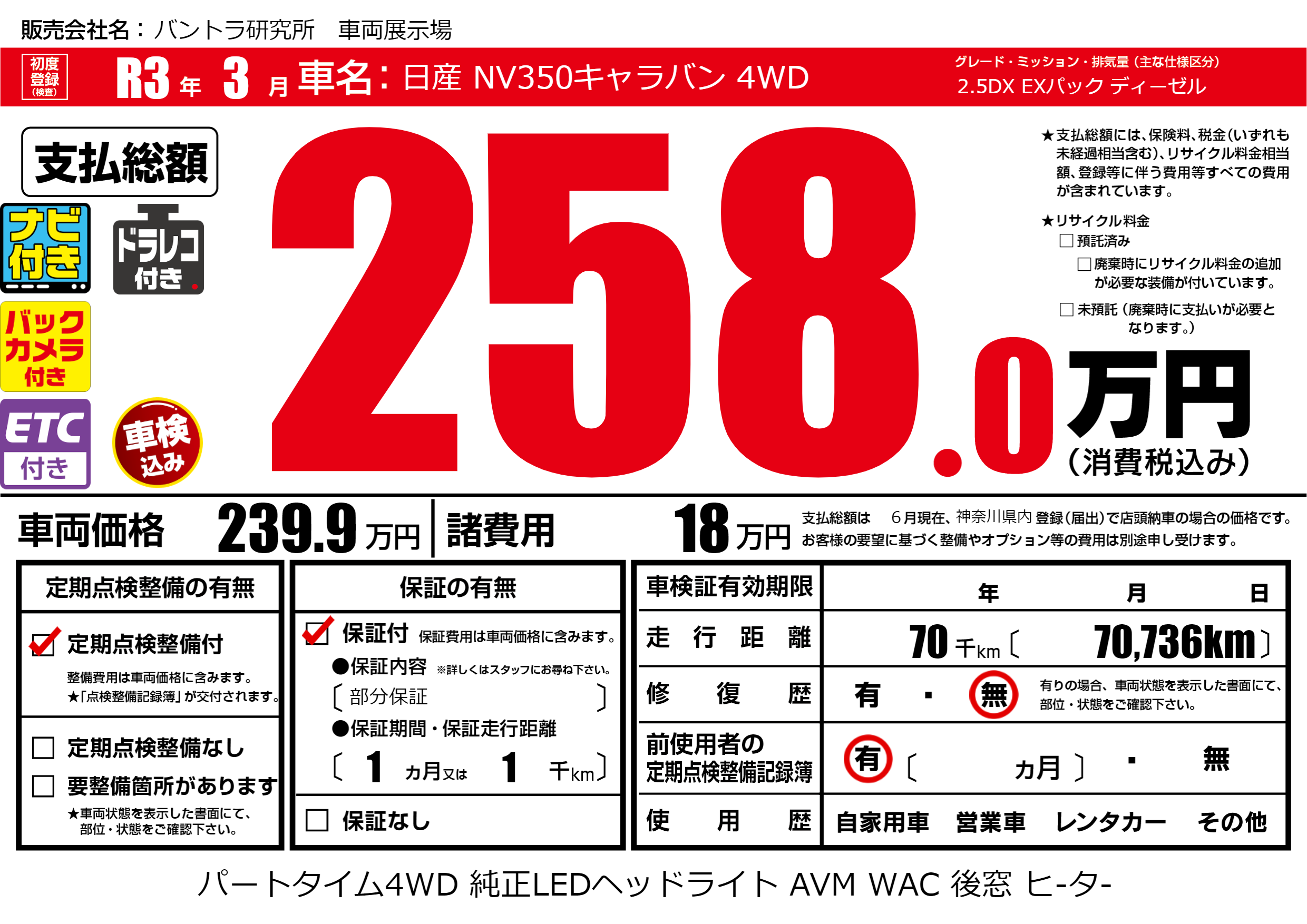 | 車名 | 日産 NV350キャラバン 4WD | グレード ミッション 排気量 |