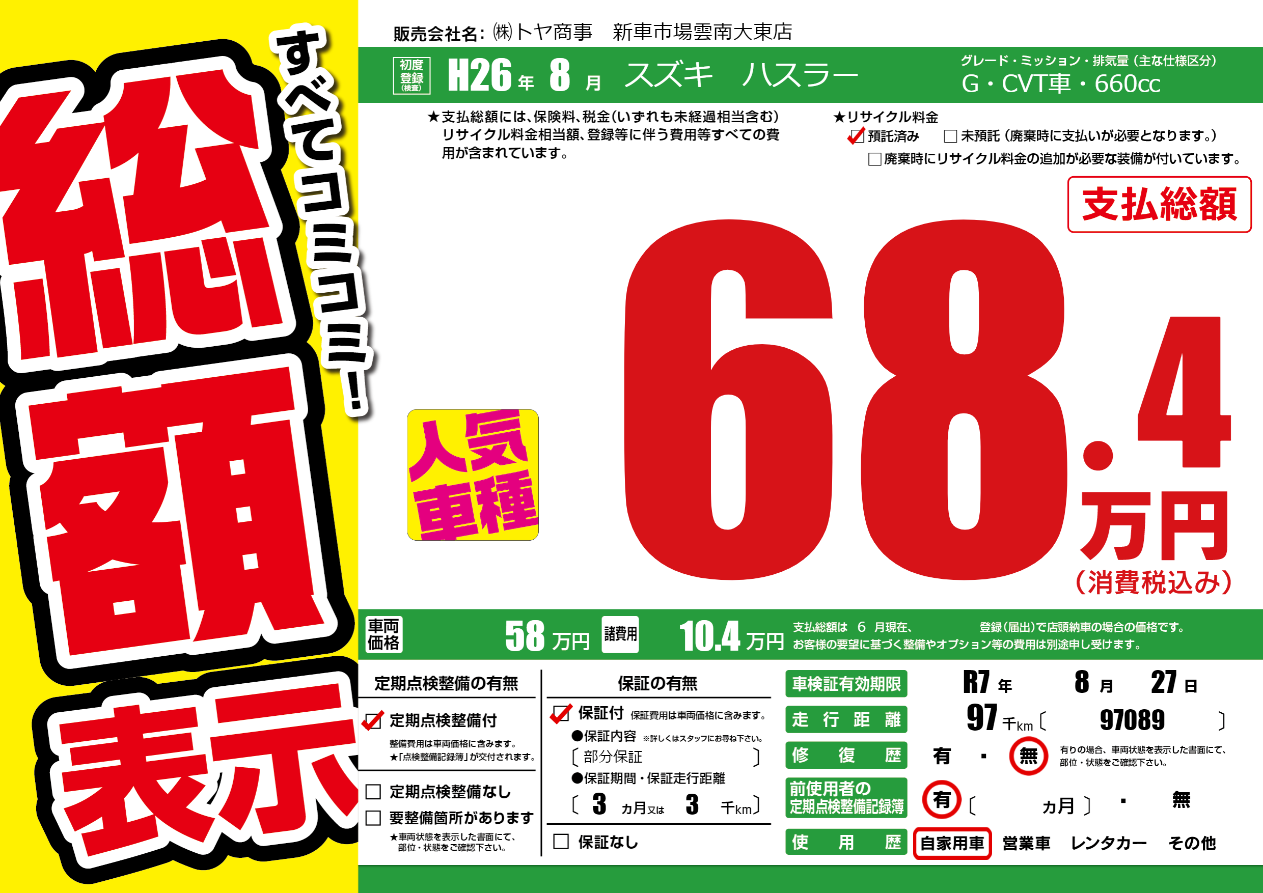 | 車名 | スズキ ハスラー | グレード ミッション 排気量 |