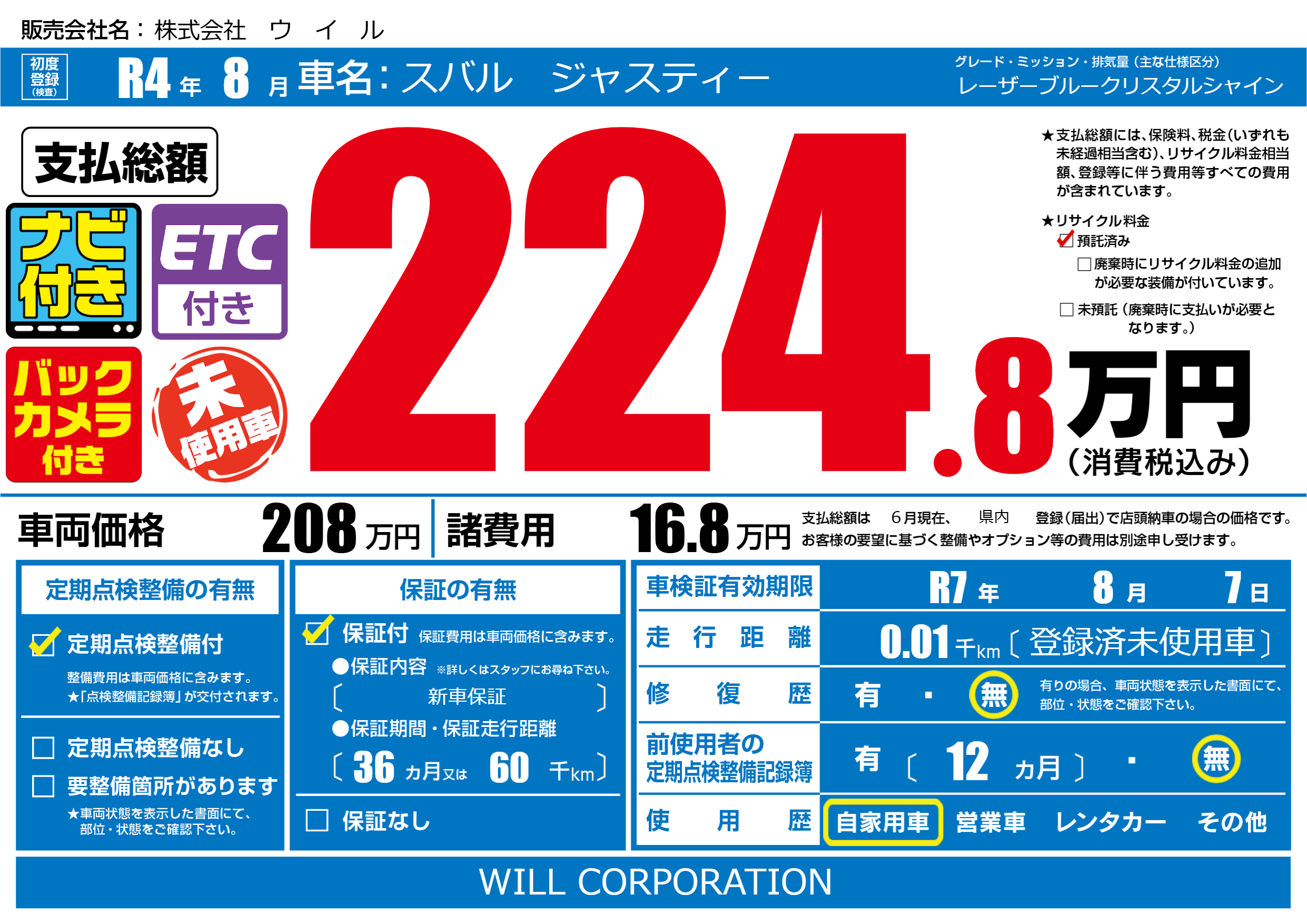 | 車名 | スバル ジャスティー | グレード ミッション 排気量 |