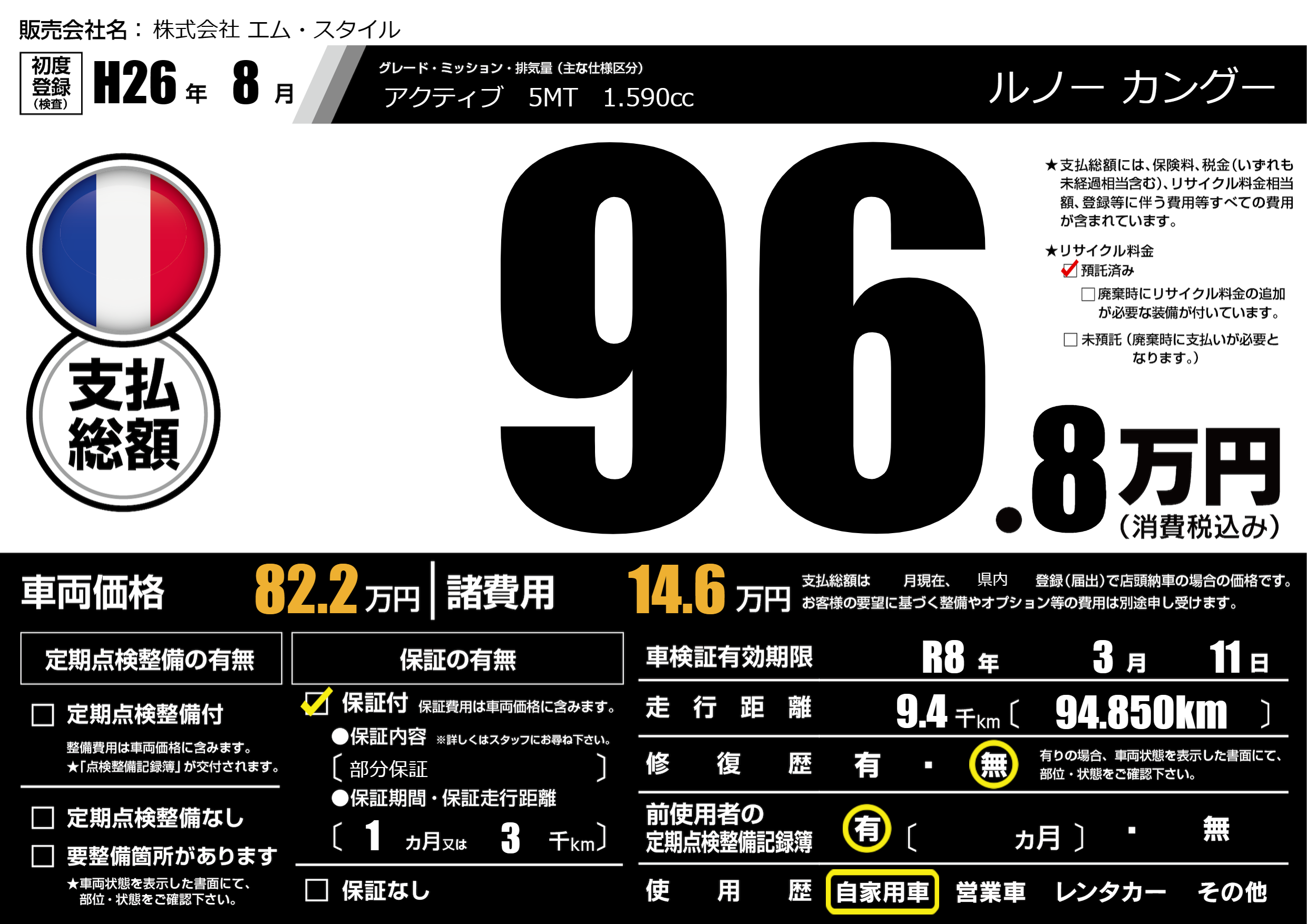 | 走行キロ | 0.9万km | 初年度登録 | H26年8月 |