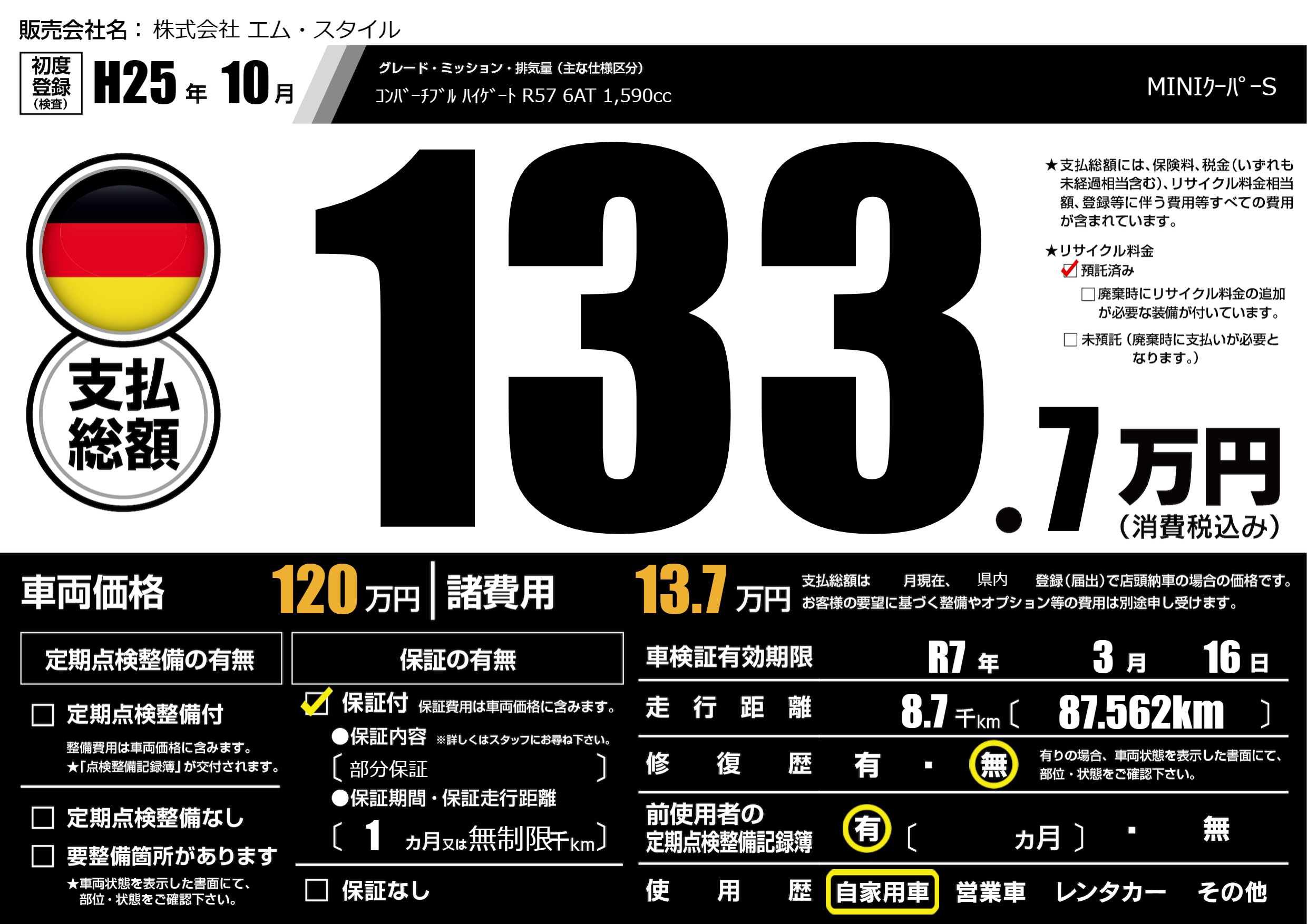 | 車名 | MINIクーパーS | グレード ミッション 排気量 |