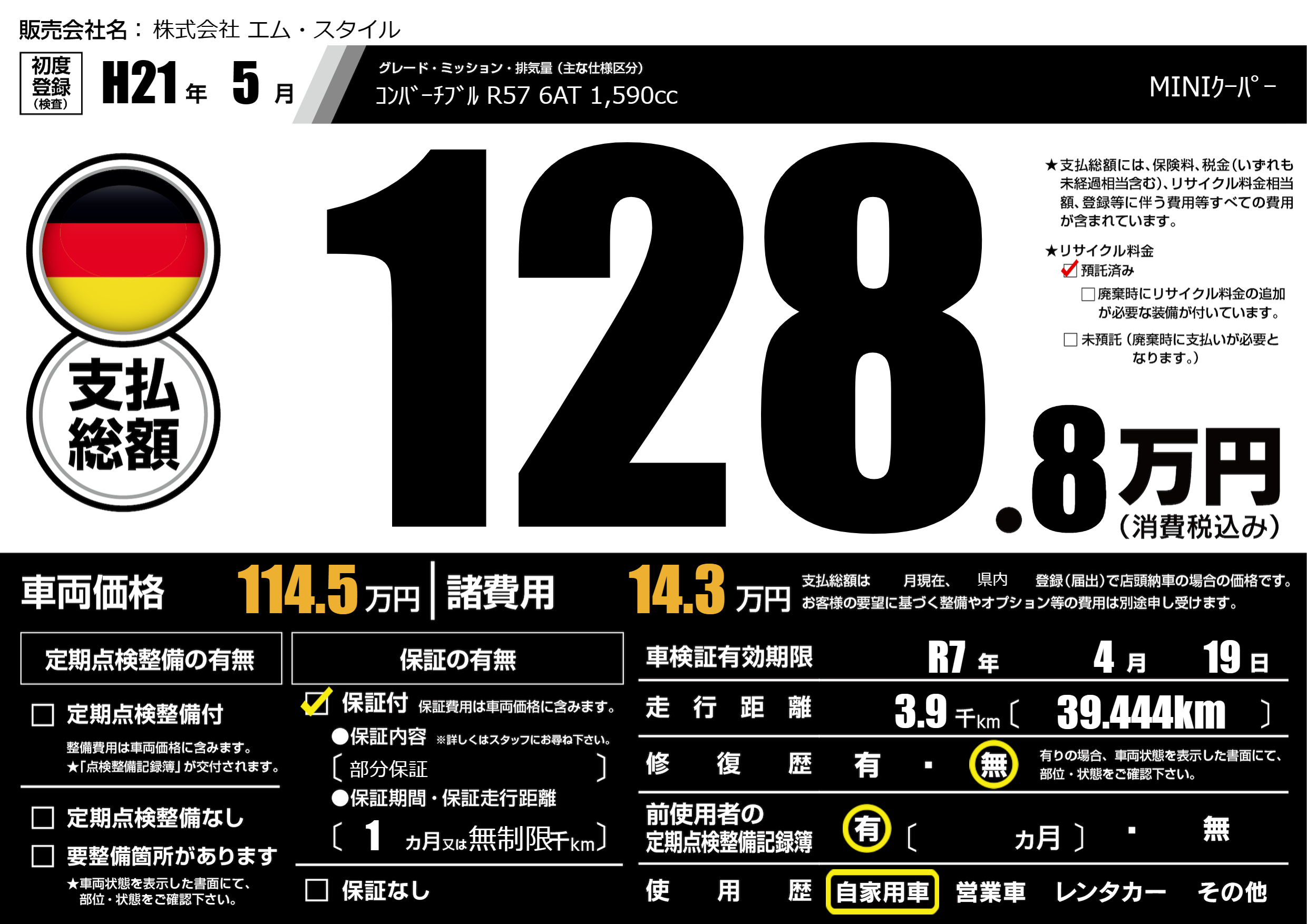 | 車名 | MINIクーパー | グレード ミッション 排気量 |