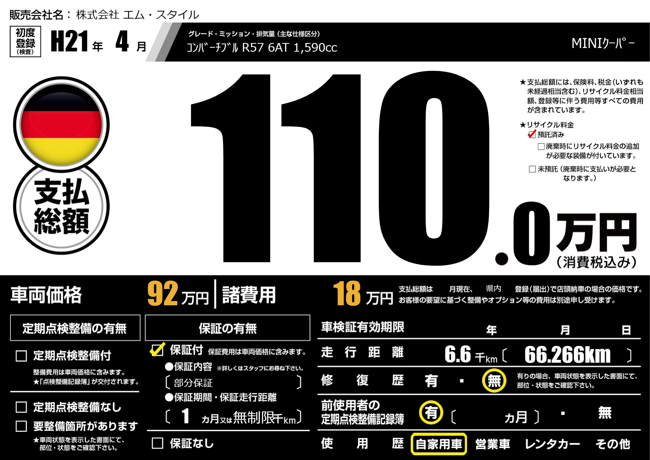 | 車名 | MINIクーパー | グレード ミッション 排気量 |