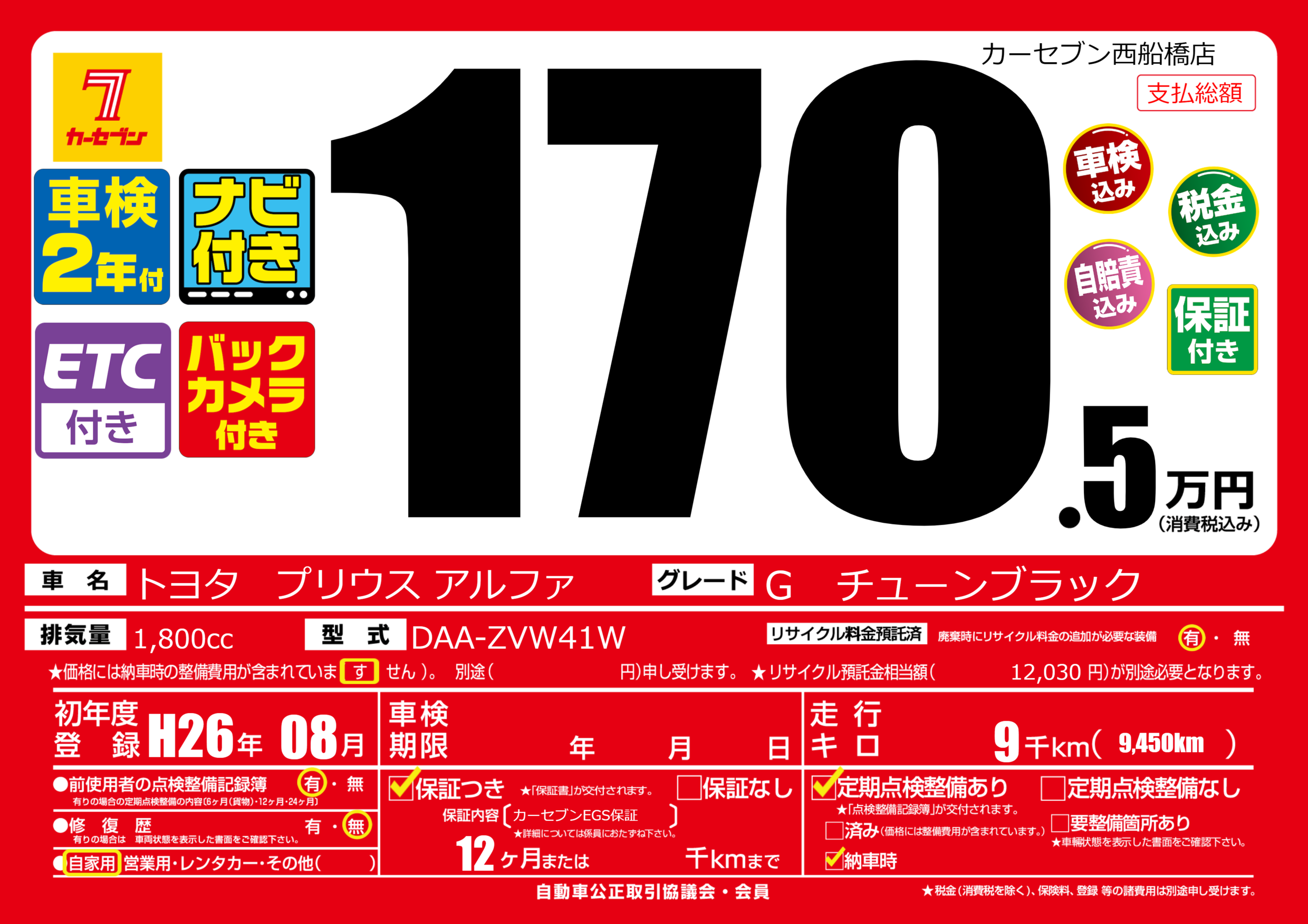 保証付き 保証内容(カーセブンEGS保証) 12ヶ月または千km |