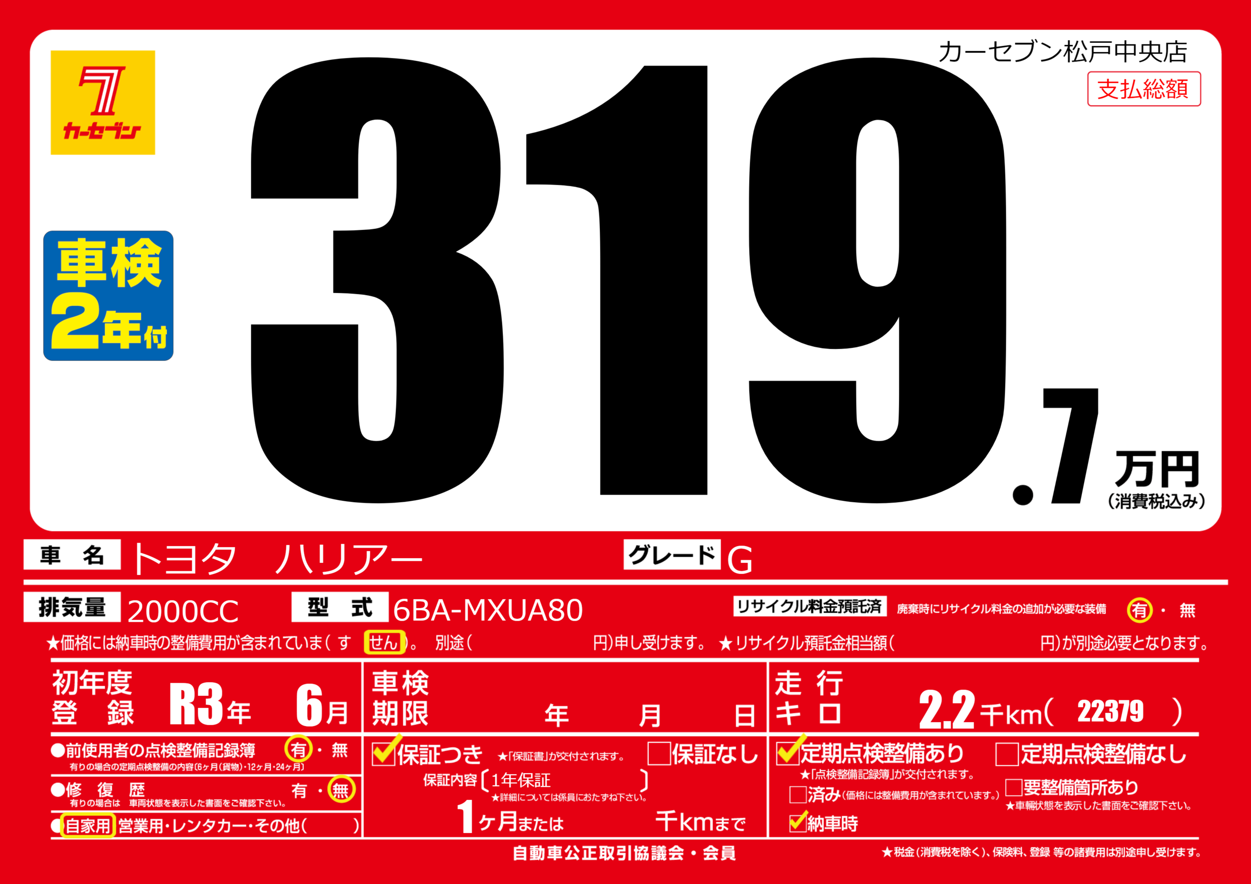 | 走行キロ | 0.2万km | 初年度登録 | R3年6月 |