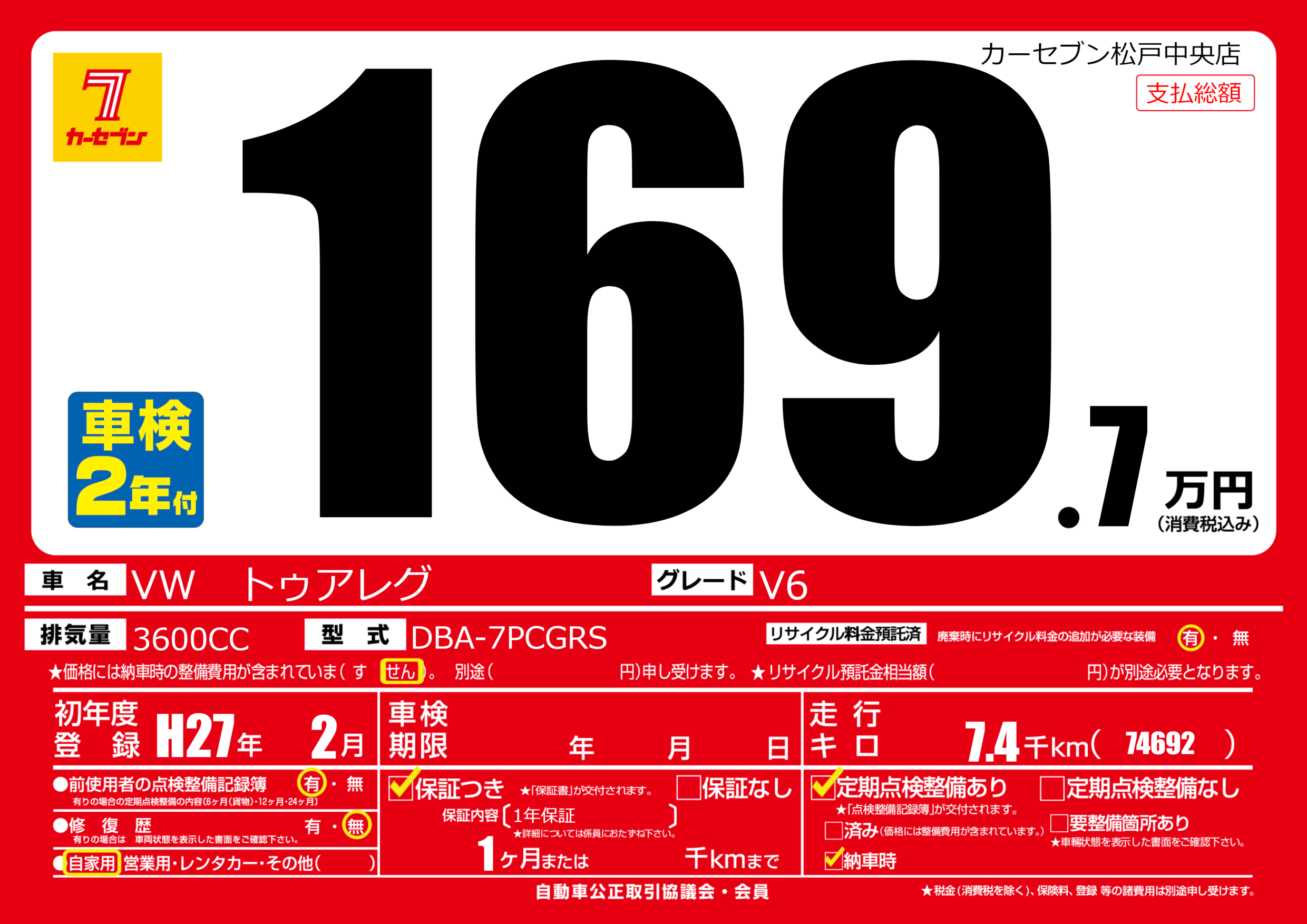 | 車名 | VW トゥアレグ | グレード ミッション 排気量 |