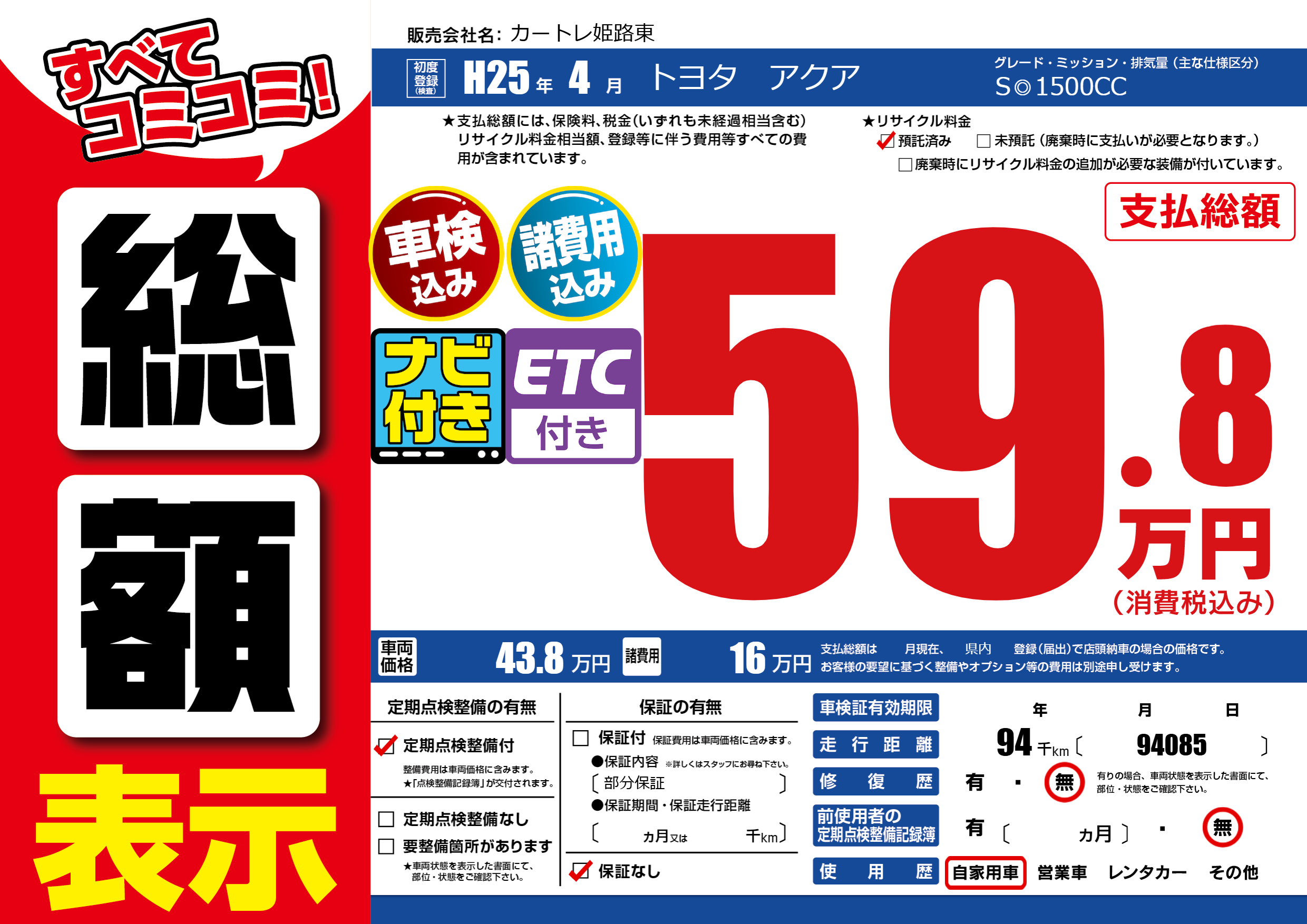 | 車名 | トヨタ アクア | グレード ミッション 排気量 |