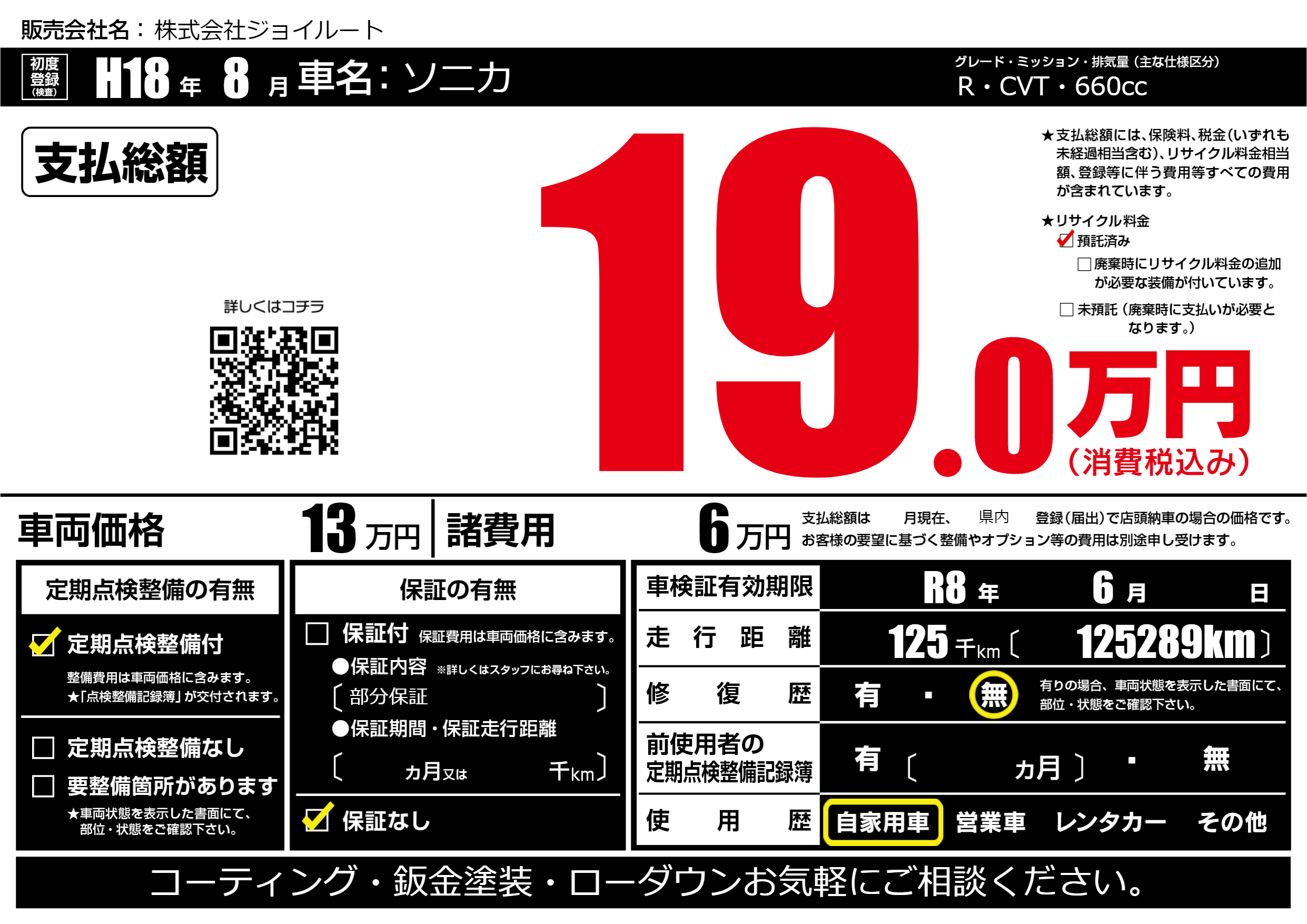 | 走行キロ | 12.5万km | 初年度登録 | H18年8月 |