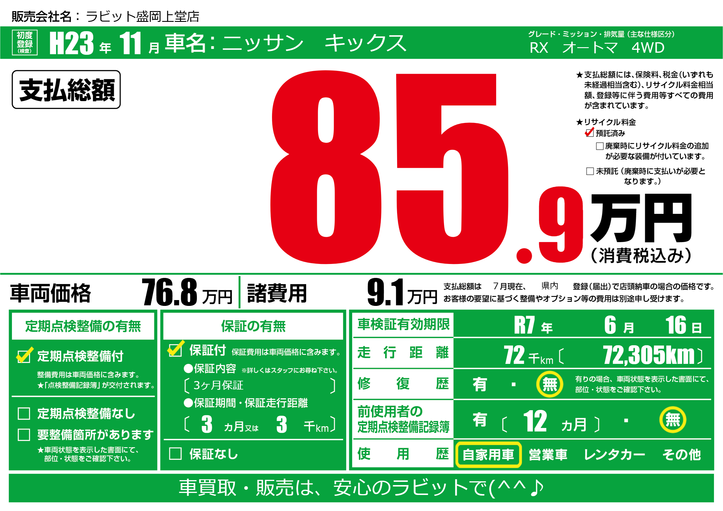 | 走行キロ | 7.2万km | 初年度登録 | H23年11月 |