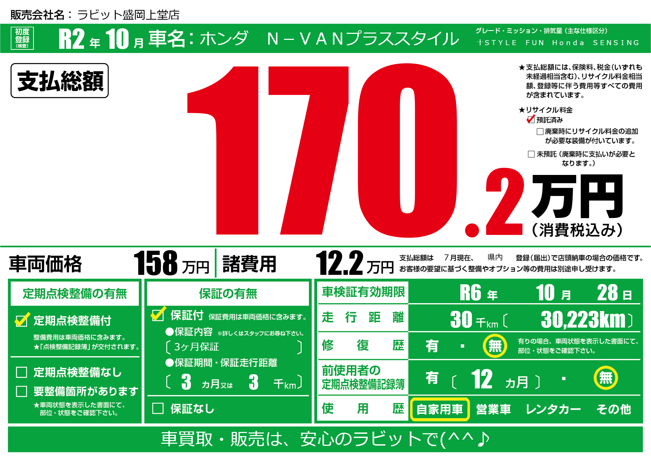 | 走行キロ | 3万km | 初年度登録 | R2年10月 |