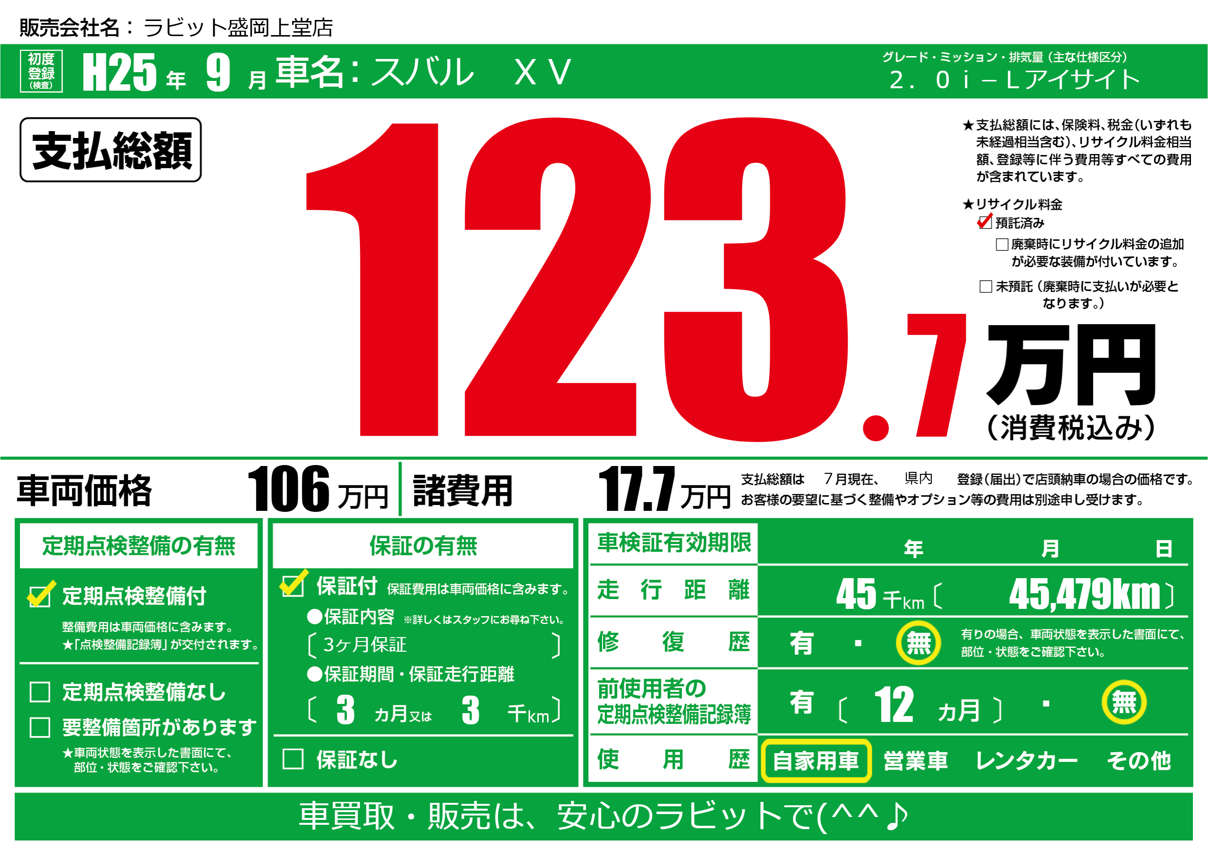 | 車名 | スバル XV | グレード ミッション 排気量 |
