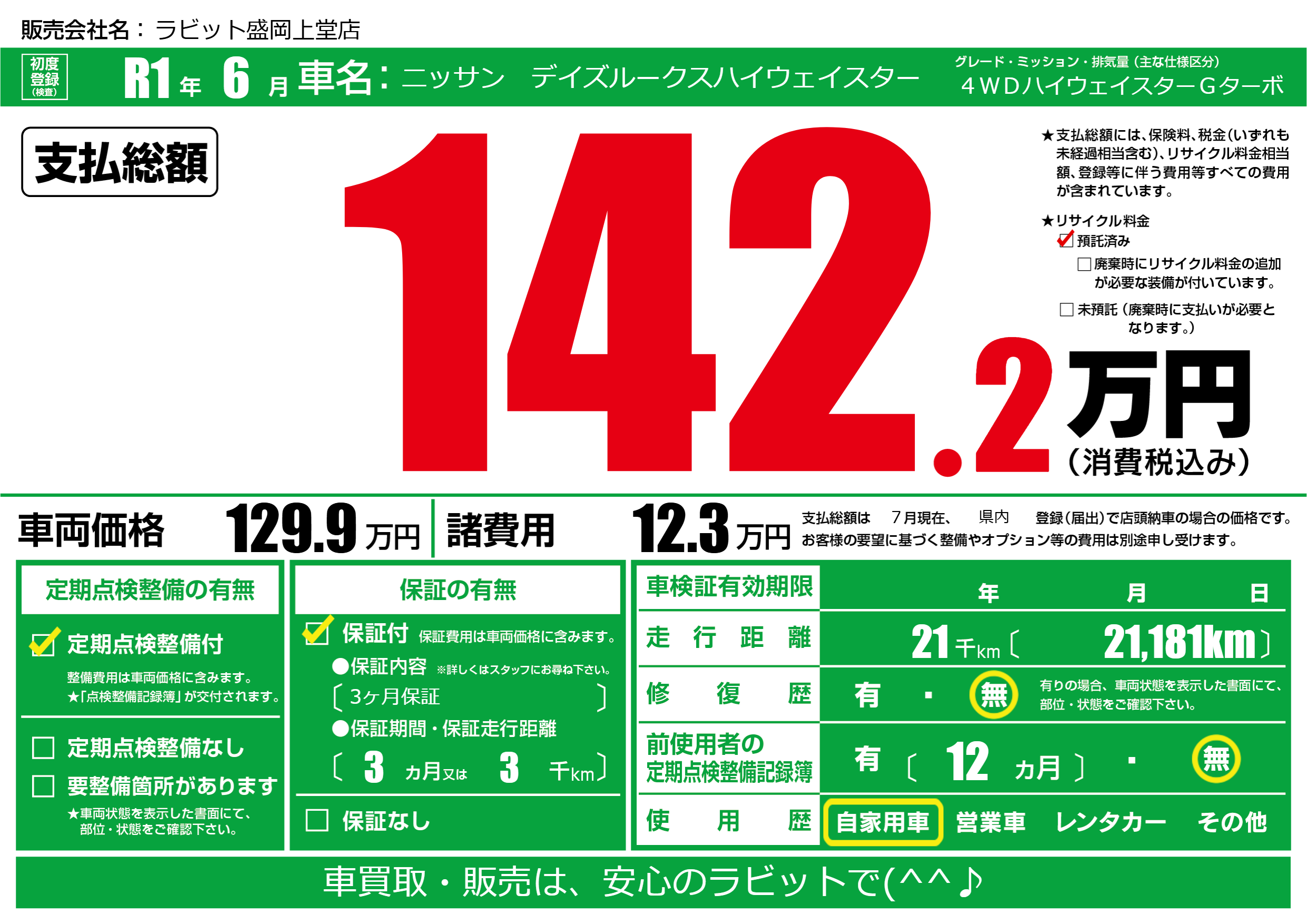 | 車名 | ニッサン デイズルークスハイウェイスター | グレード ミッション 排気量 |